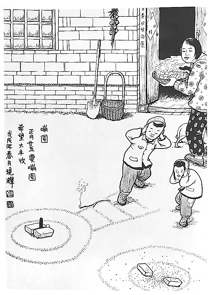 依稀記得,兒時每到正月二十四晚上做飯時,娘就在灶膛里多燒些柴火,為的是多落點柴草灰,準備“打囤”用。第二天,天還不亮,繁星滿天,家家戶戶燈火通明,娘把我從睡夢中喊起來,幫著爹在灶膛里把灰扒出來,我端著簸箕,爹一把灰一把灰地打囤。先在堂屋打個“小囤”,放上五分或一角錢,這叫“錢囤”,在院內和大門外打上“大囤”。天不亮不出太陽,不能把雞從雞窩里放出來,生怕它們偷吃糧囤里的糧食。我娘和姐姐在屋里包餃子,姐姐不能參加打囤,說是沒出嫁的閨女摻和不吉利。餃子煮熟后,我點著掛在樹枝上的小鞭炮,伴隨著啪啪的鞭炮聲,全家坐在一起吃餃子。吃完餃子后,爹說:“小子,趕緊給后鄰你大娘、嬸子家扛口袋去。”“扛口袋”,就是幫著別人“填倉”。各家各戶都盼望著有人去幫忙“扛口袋”,意味著他家糧食豐收、大囤滿小囤流。我來到大娘家,一進大門就高聲喊:“大爺、大娘,俺給你家扛口袋來了?!贝鬆?、大娘笑呵呵地從屋里迎出來,高興地說:“你看俺朝兒還接濟大爺大娘,來小子快屋里吃餃子?!薄按鬆敶竽镂页赃^了,俺還得給嬸子家扛口袋去?!蔽艺f。大爺說:“小子,你先別著急走,我給你拿糖吃?!彪S后大爺在屋里抓出一把糖塊塞進我兜里。這一早起,我“扛口袋”掙了半兜兜糖,回家后,把勞動果實分給姐姐吃。這時,天已大亮。娘說:“朝兒,把錢囤里的錢拿出來,歸你了?!弊詈笪夷弥X,愛不釋手地交給娘保管。