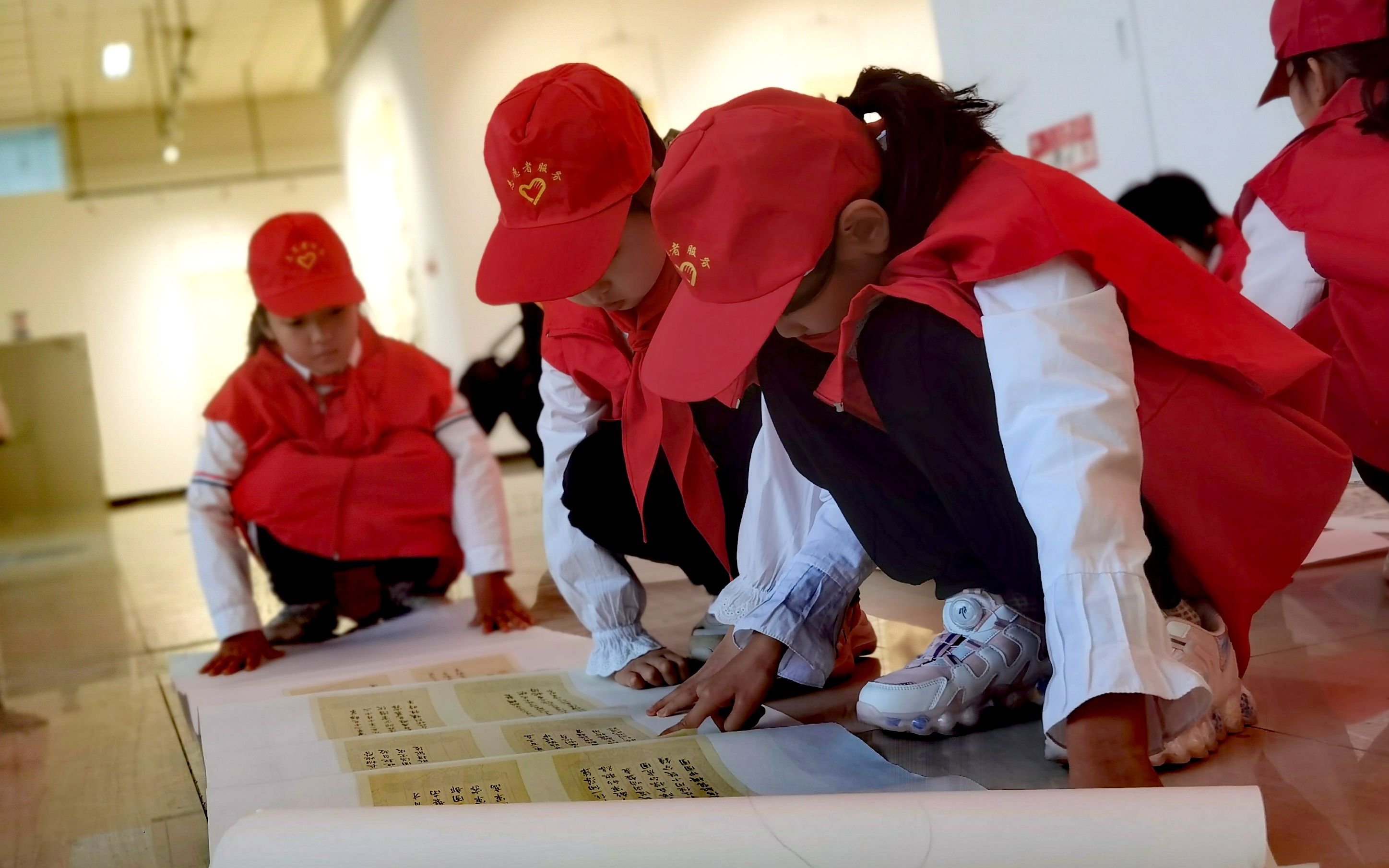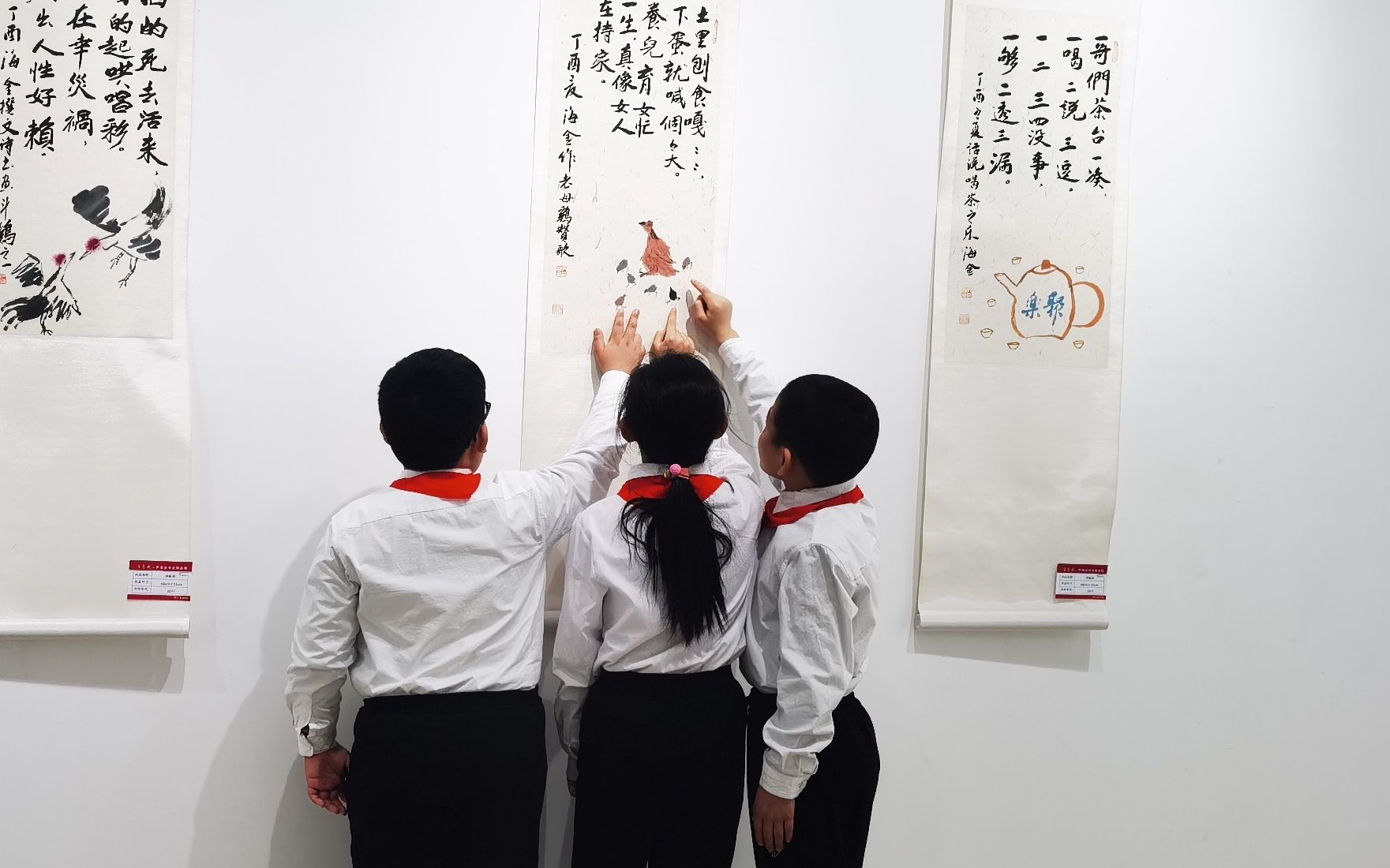 當日上午9時許,師生們一走進展廳,就被眼前展出的一幅幅蒼勁靈秀、氣韻生動、雄渾筆健的書法作品所吸引。“漢字是中華文化之根,中華民族之魂,小朋友要爭做傳統(tǒng)文化的參與者、踐行者、傳播者。當你們拿起筆來端端正正地寫字,傳統(tǒng)文化的智慧和氣韻就傳遞給你們,書法藝術繼承和發(fā)展的重擔也交給了你們。”尹海金邊領著學生們觀展,邊以展覽中的作品為依托,給大家講解行書、草書、楷書等書體的特點,傳授習書要義。沉浸在書畫藝術中的孩子們或凝神細視,或低聲交流,對于喜愛的作品,更是反復品味,間或發(fā)出由衷的感嘆聲。