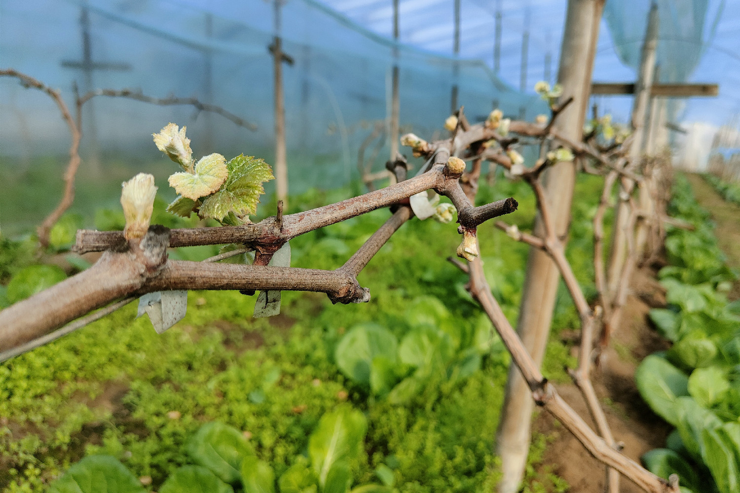 棚內葡萄在溫暖潮濕的環境下已經鉆出了嫩芽。石鳳婷 攝