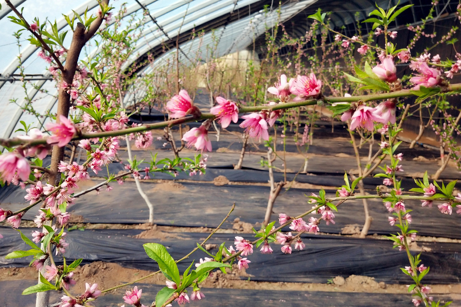 西堤北村的蟠桃大棚內桃花朵朵綻放。李亞喃 攝