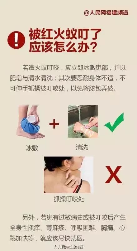 如果被蜇,注意!不要抓撓被蜇部位,避免將膿包抓破,以防引起繼發感染!發現紅火蟻或蟻巢時,切勿觸碰或用木棍等撥弄,應立即向相關部門報告,請專業人員處理。