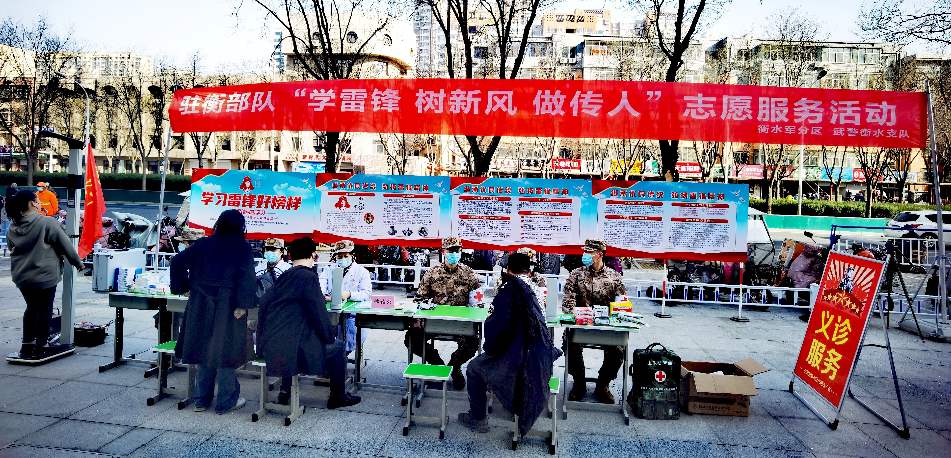 3月4日,在毛澤東等老一輩革命家為雷鋒同志題詞60周年之際,衡水軍分區攜手武警衡水支隊開展“學雷鋒 樹新風 做傳人”志愿服務活動,80多名官兵走上市區街頭清掃道路,為市民義診、理發、修車,用實際行動踐行弘揚雷鋒精神。