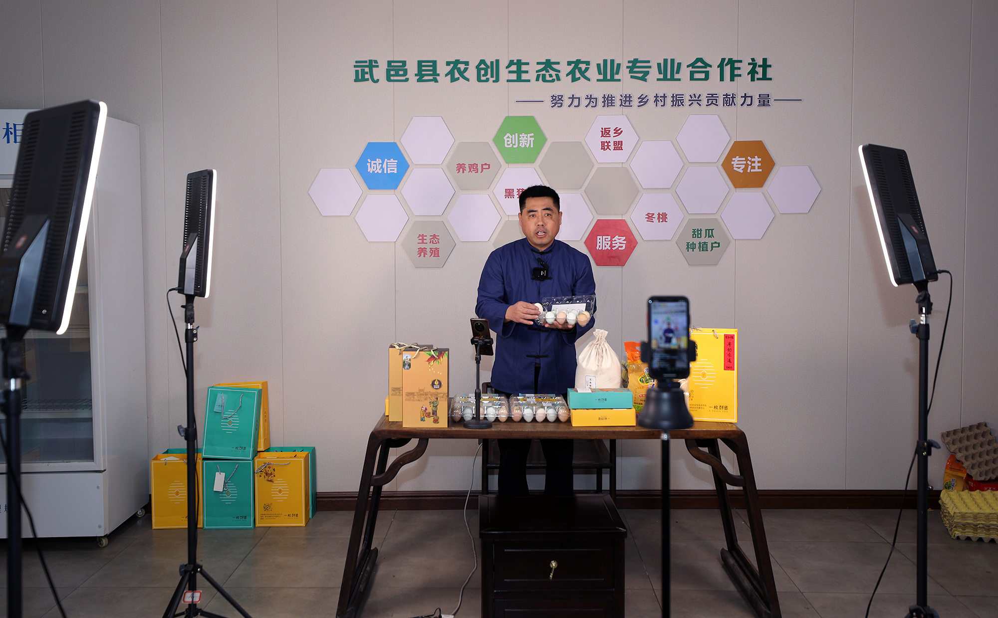 李曉輝回到家鄉創辦了武邑縣農創生態農業專業合作社,跟本村和鄰村現有的散養土雞、黑豬、冬桃、蟠桃、秋月梨,王林蘋果,黑小米全粉,玉米面等當地的農產品、散養黑豬肉扣碗等農產品來合作,以定制價格收購,保證了種植戶與養殖戶產品價格的穩定性,讓農戶保證產品質量,種好養好就行,不去為銷售發愁,增加了農產品的價值,也增強了村民們的致富信心。