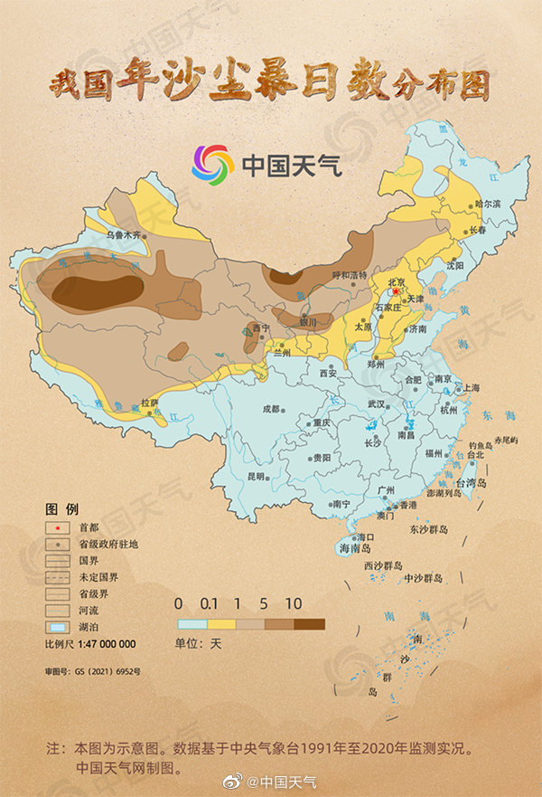 中國天氣網統計1991年至2020年來,我國沙塵暴日數的分布情況,可以看出沙塵天氣主要影響我國北方地區,其中,南疆盆地和內蒙古西部兩地是沙塵暴的高發區,年沙塵暴日數在10天以上,部分地區超過20天。