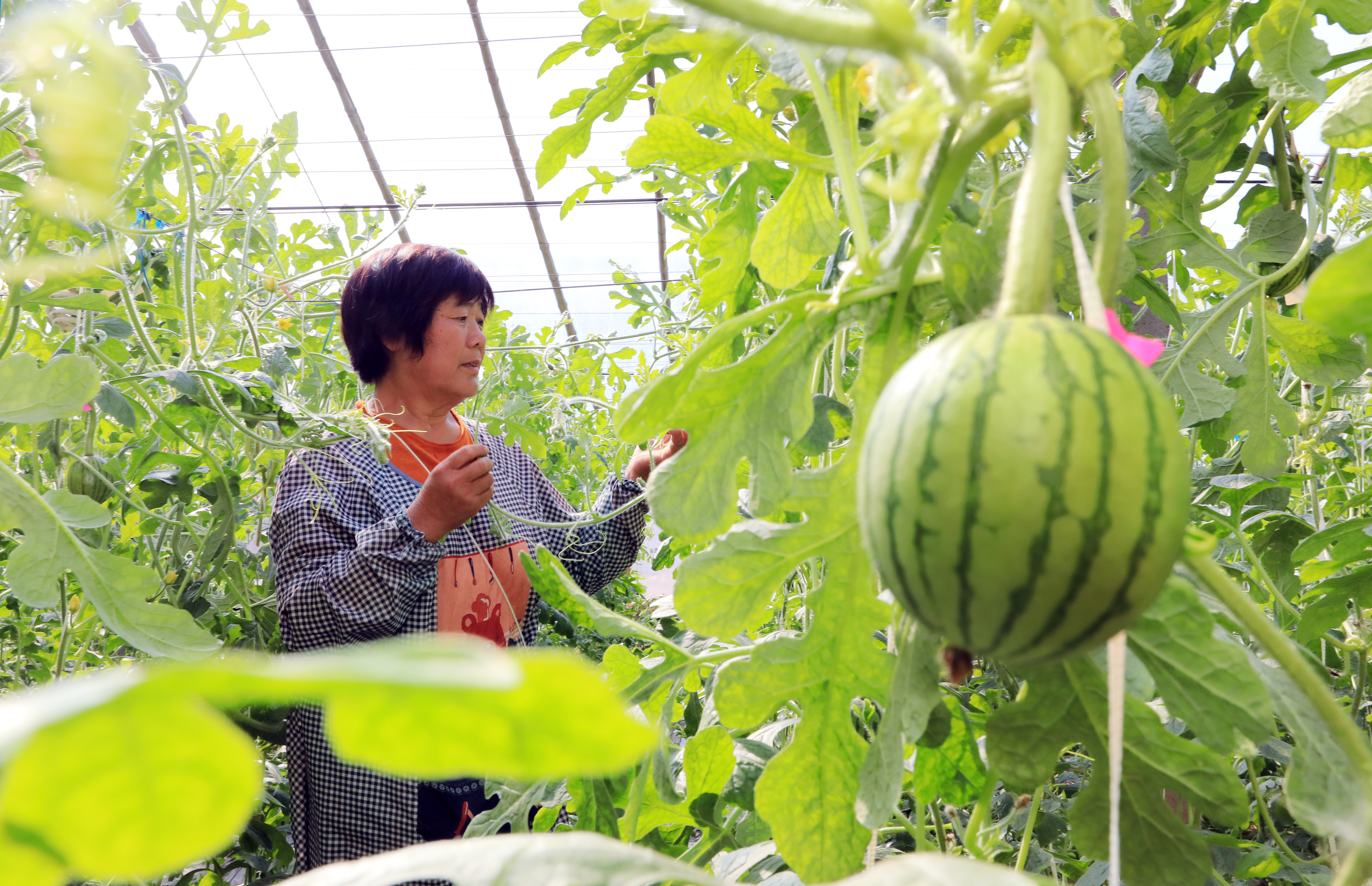 饒陽縣河北新饒農業科技有限公司員工對西瓜進行種植管理。