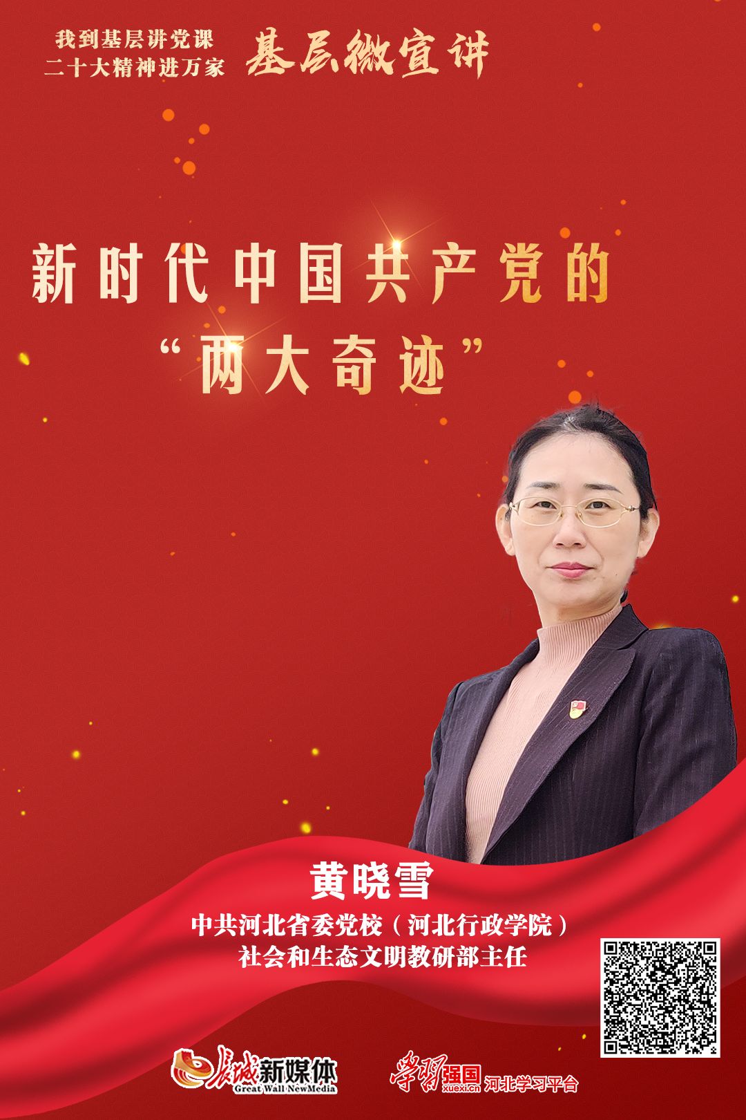 本期基層微宣講讓我們一起走進“兩新”組織(新經濟組織、新社會組織),聽一聽中共河北省委黨校社會和生態文明教研部主任黃曉雪的精彩解讀——《新時代中國共產黨的“兩大奇跡”》。