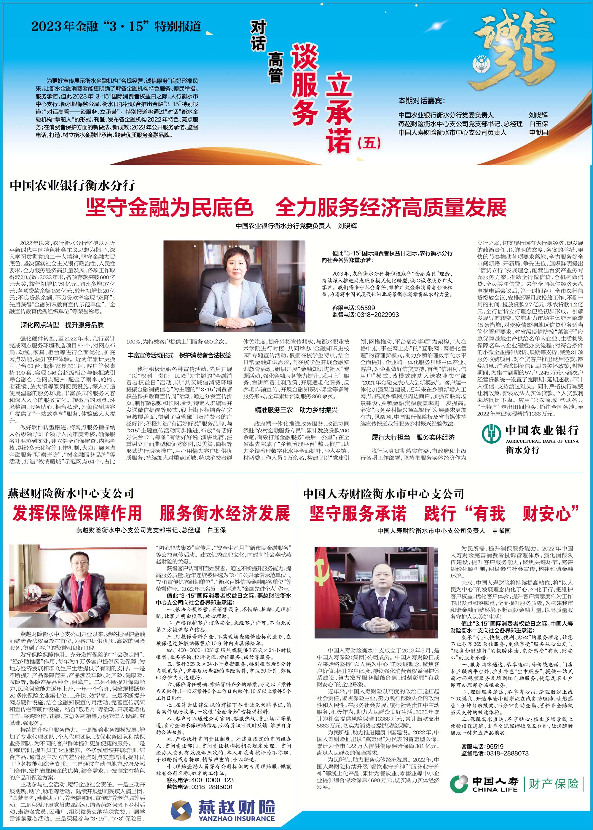 為更好宣傳展示衡水金融機構“合規經營、誠信服務”良好形象風采,讓衡水金融消費者能更明確了解各金融機構特色服務、便民舉措、服務承諾,值此2023年“3·15”國際消費者權益日之際,人行衡水市中心支行、衡水銀保監分局、衡水日報社聯合推出金融“3·15”特別報道:“對話高管——談服務、立承諾”。特別報道通過“對話”衡水金融機構“掌舵人”的形式,刊登、發布各金融機構2022年特色、亮點服務;在消費者權益保護方面的新做法、新成效;2023年公開服務承諾、監督電話,打造樹立衡水金融業承諾踐諾優質服務金融品牌。