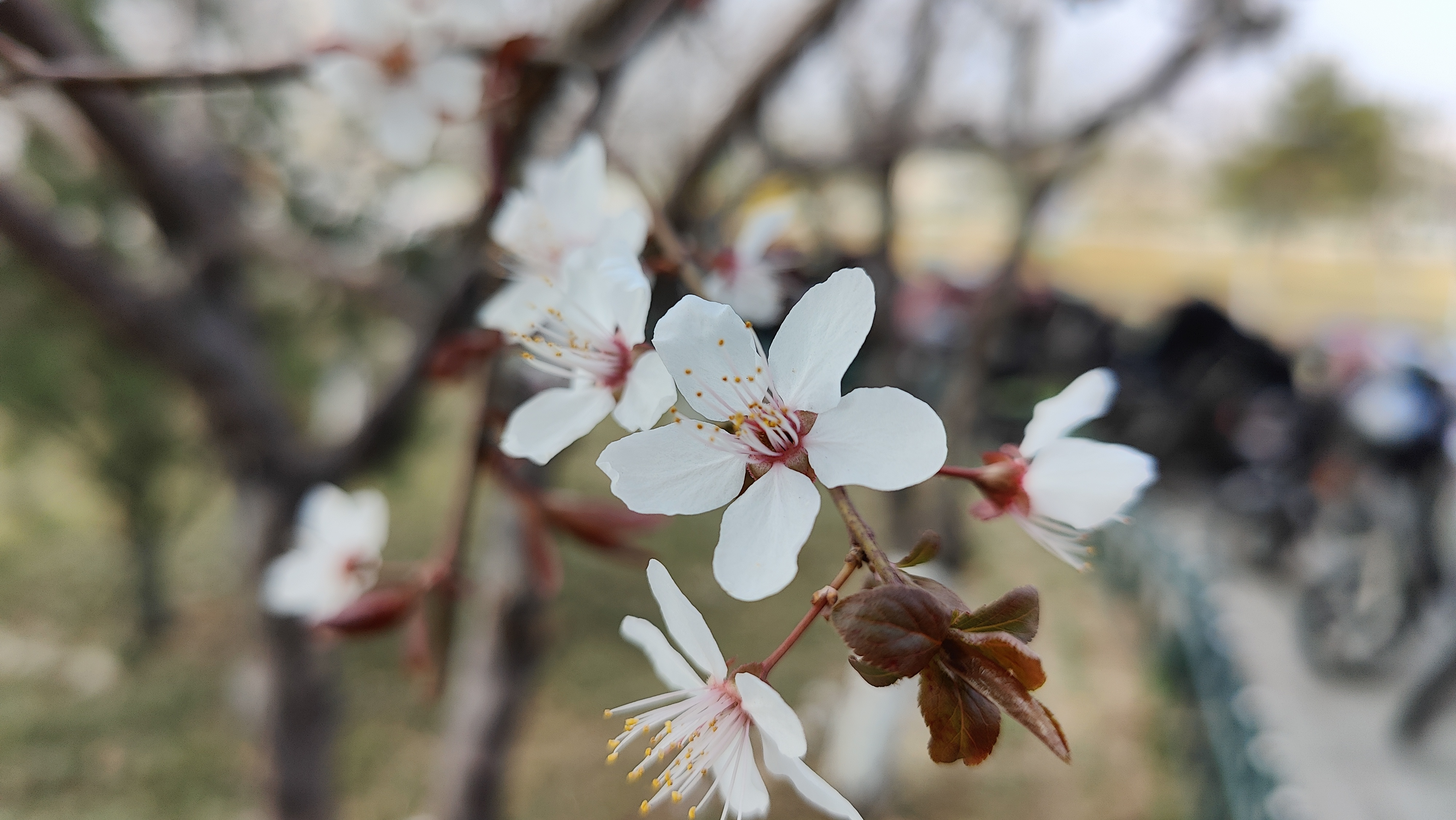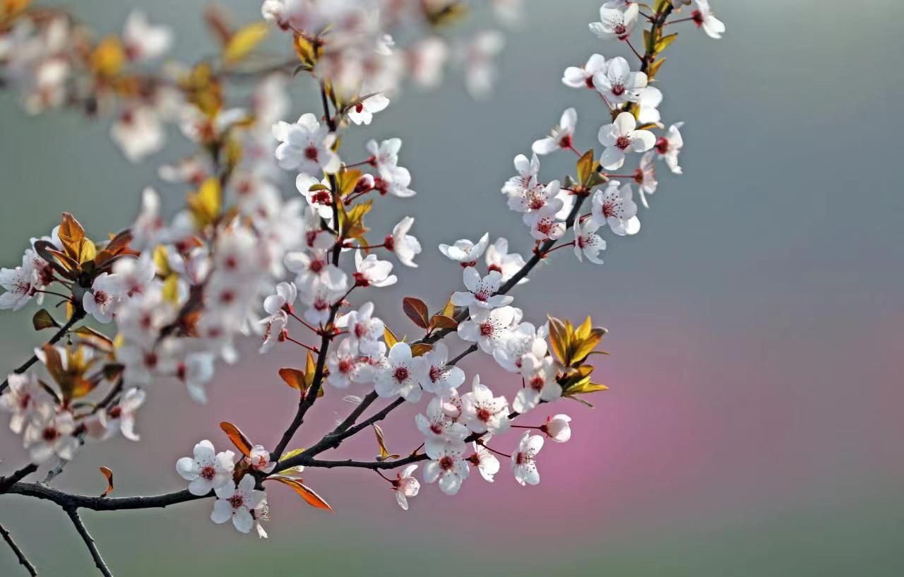 廣場上的紫葉李花,花朵細碎小巧,星星點點的花開滿枝頭,滿樹花朵粉中泛白,與紫紅色的葉子相互映襯,散發著幽幽馨香,沁人心脾。花瓣隨風飄落,就像漫天飛雪,美不勝收。真可謂:白花冷若雪,紫葉艷如霞?;ò険u曳,在這里,你能體驗“粉雪”的浪漫。