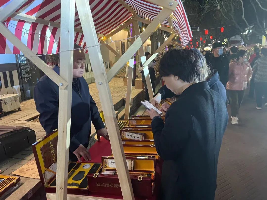 當天晚上8時許,在周窩音樂小鎮風情街,一排排紅白相間的銷售攤位整齊排列,陳列著來自我省各市縣的特色商品,吸引了很多群眾駐足觀看,爭相購買,現場氣氛非常熱鬧。