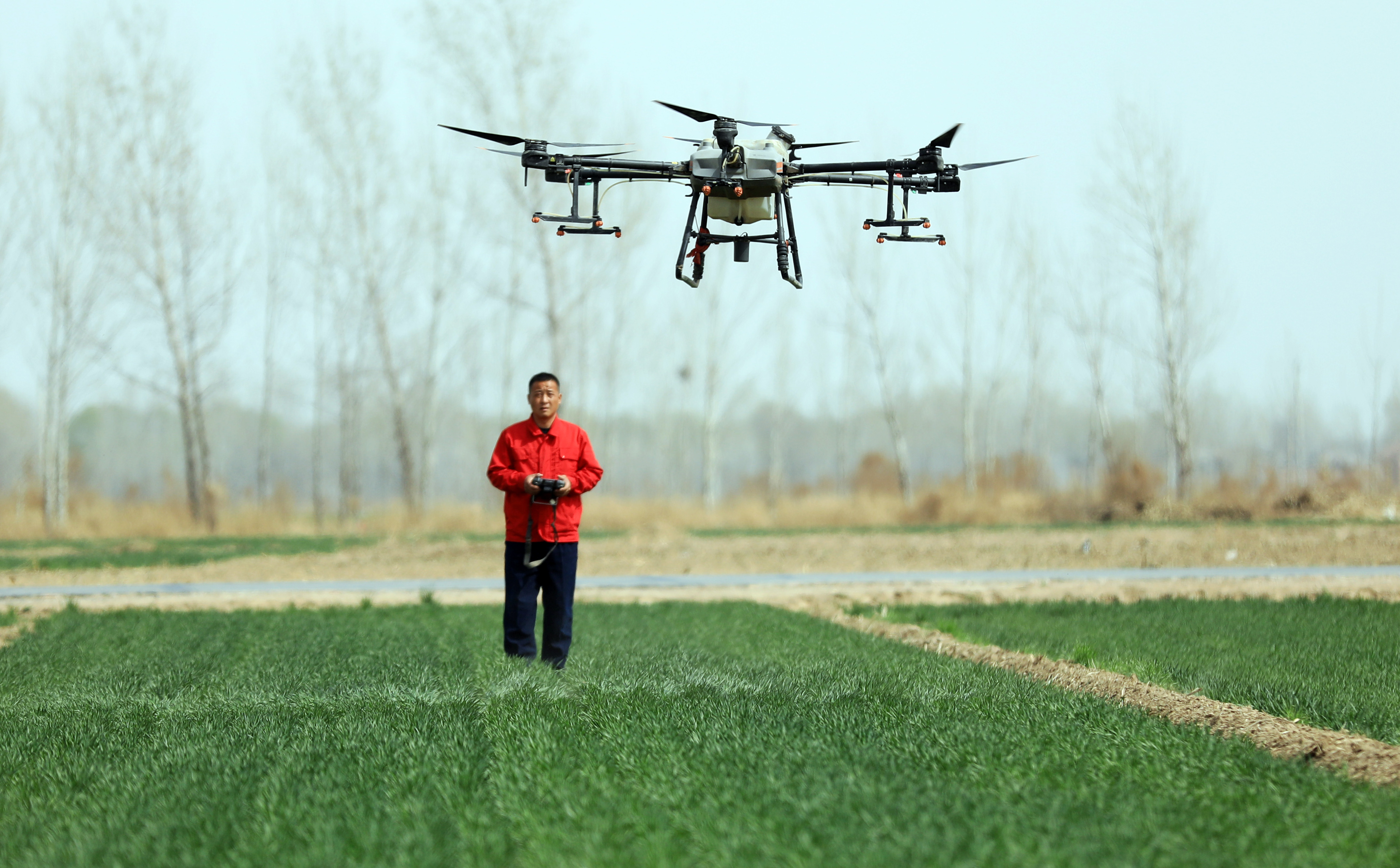 武邑縣順天機械農業合作社的技術員正在使用無人機施肥。