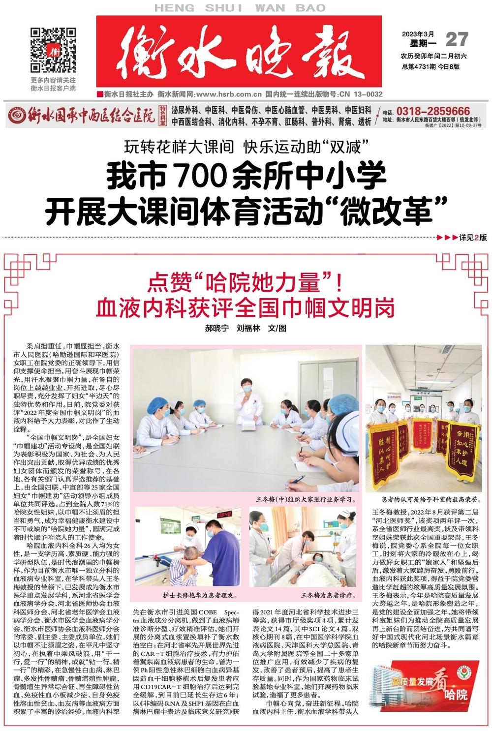 談及帶領科室姐妹榮獲此次全國重要榮譽,王冬梅說,院黨委心系全院每一位女職工,時刻將大家的冷暖放在心上,竭力做好女職工的“娘家人”和堅強后盾,激發著大家踔厲奮發、勇毅前行。血液內科獲此獎項,得益于院黨委營造比學趕超的濃厚高質量發展氛圍。王冬梅表示,今年是哈院高質量發展大跨越之年,是哈院形象塑造之年,是黨的建設全面加強之年。她將帶領科室姐妹們為推動全院高質量發展再上新臺階而團結奮進,為共同譜寫好中國式現代化河北場景衡水篇章的哈院新章節而努力奮斗。