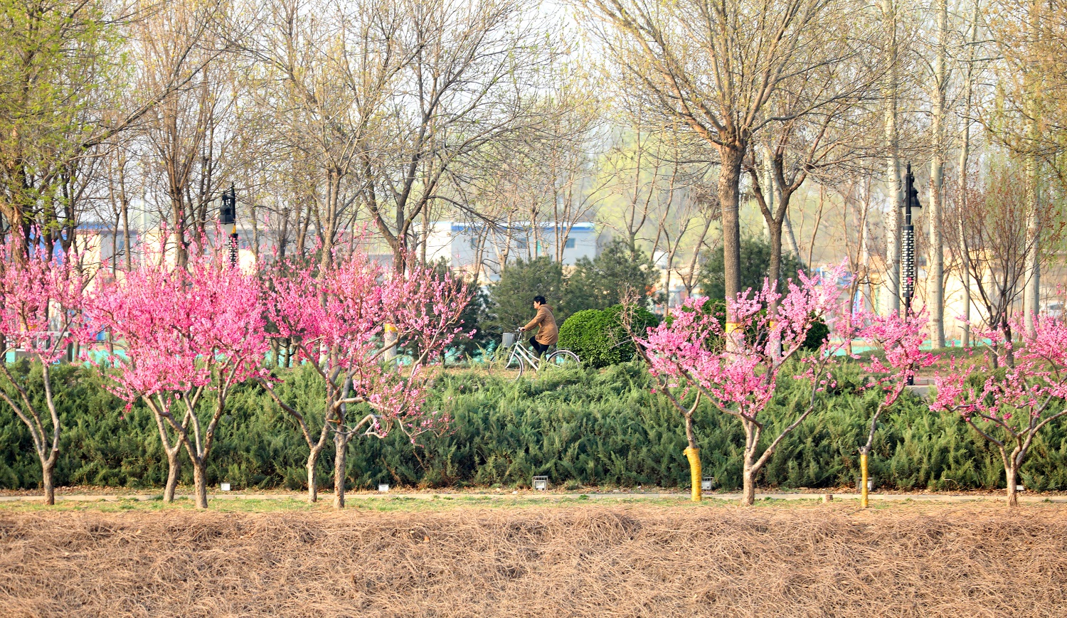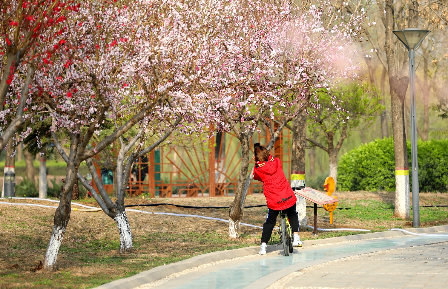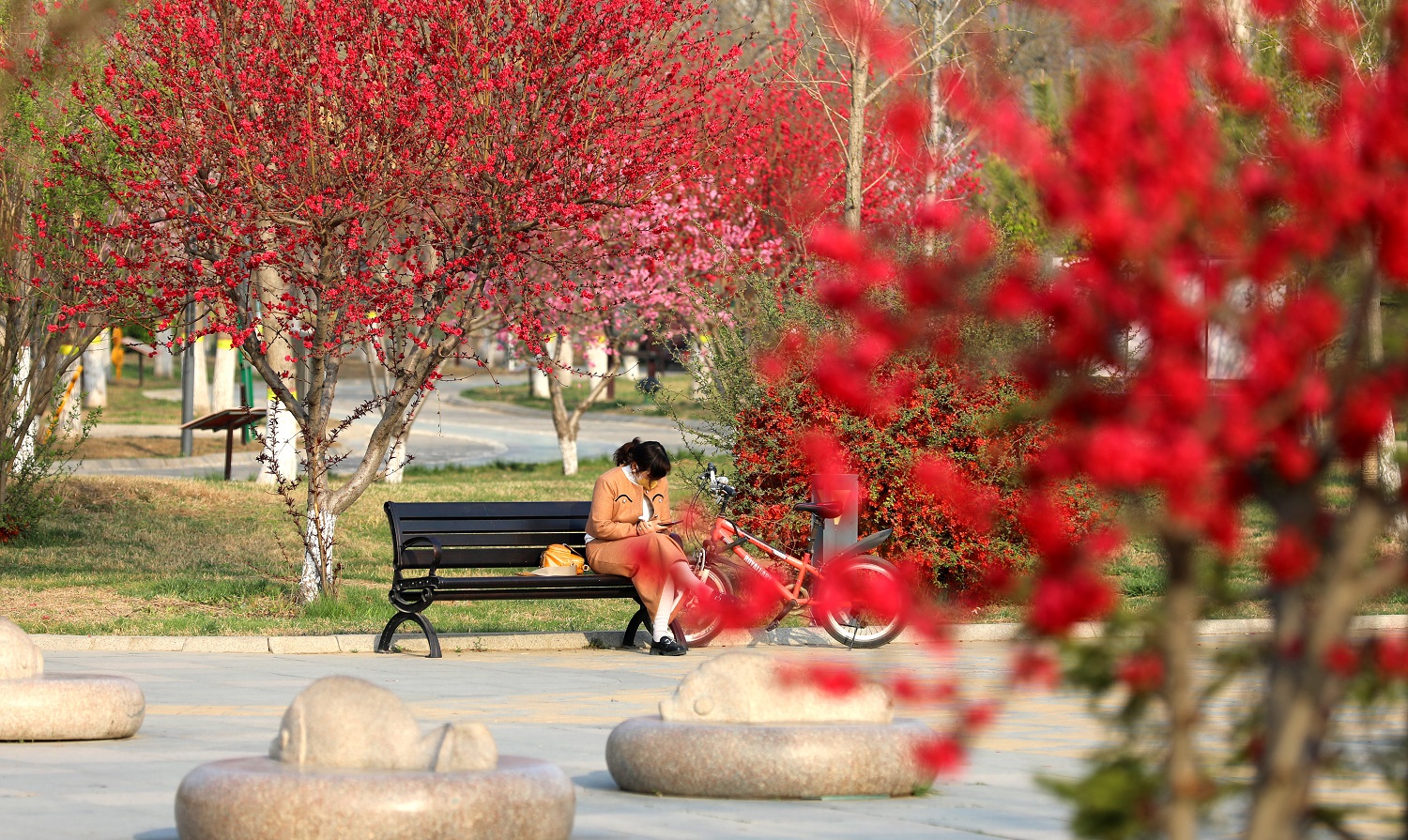 等閑識得東風面,萬紫千紅總是春。絢麗春色是最好的語言,吸引著游人前去賞花踏青。人們或是騎行或是漫步,順著彎曲的小徑前行,仿佛去往桃花源的路上。路邊嬌艷的花朵掛滿枝頭,熱烈優雅,一朵有一朵的韻味,一枝有一枝的風姿。還有游人干脆坐下來,趁著春光明媚,與花兒“約會”,構成了一幅“人面桃花相映紅”的美好畫卷。