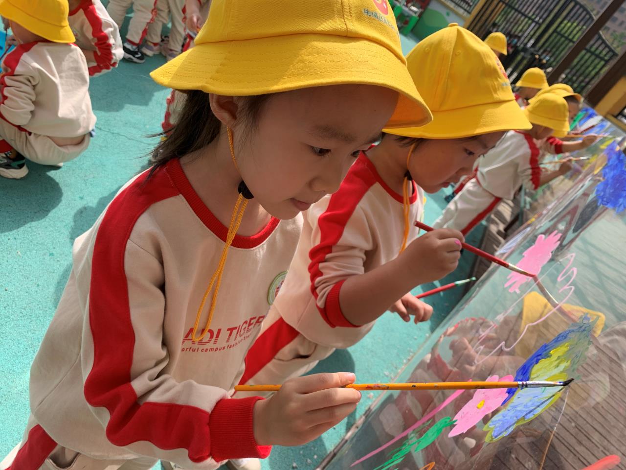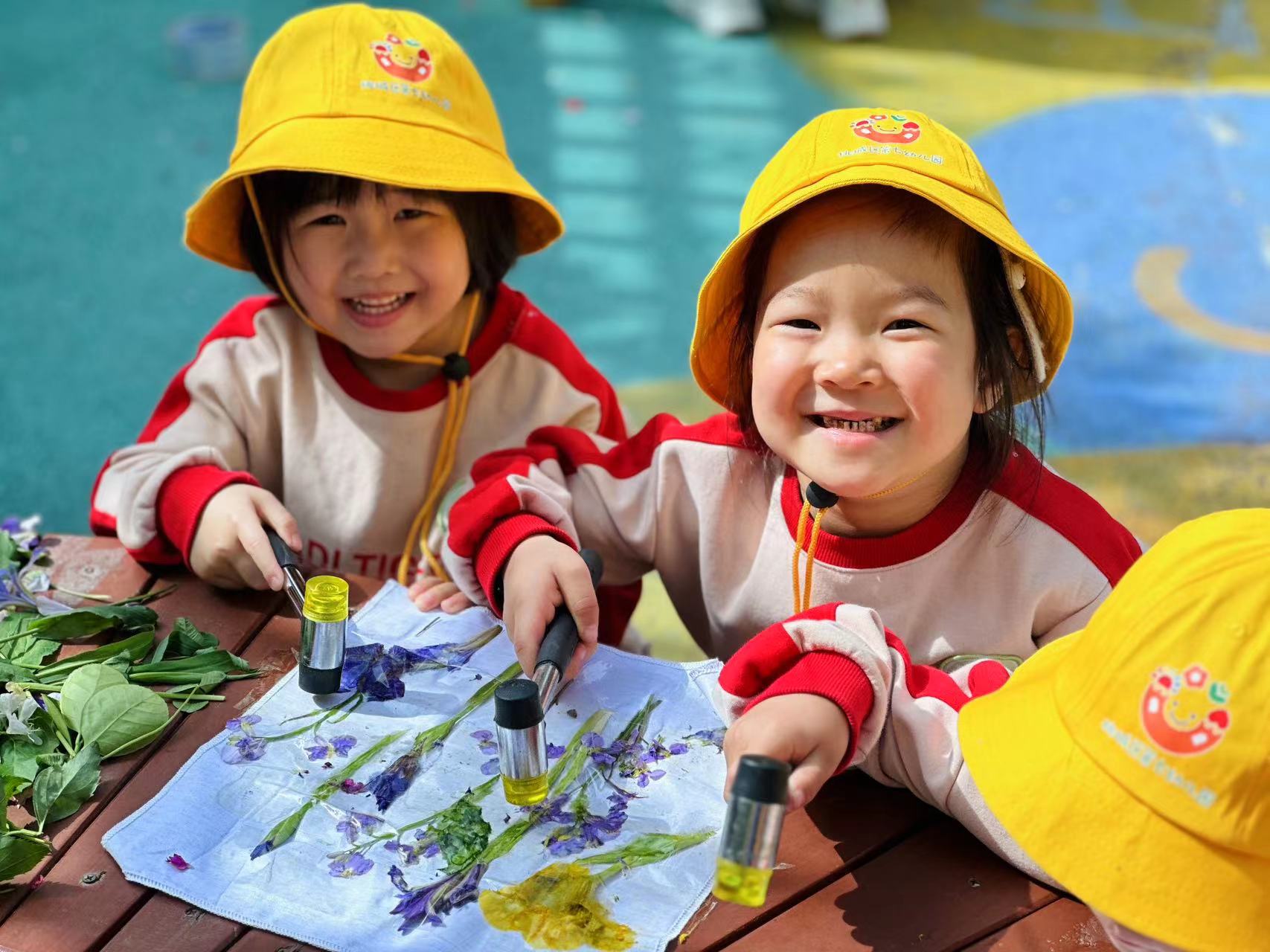 活動(dòng)中,孩子們還玩起了有趣的拓印畫,他們紛紛拿起手中的樹葉、花朵擺出各種造型,用手中的錘子捶打、手掌按壓……將各種植物自然的色調(diào)與美好留存在紙上。此外,孩子們還用手中的畫筆描繪出心中多彩的春天。