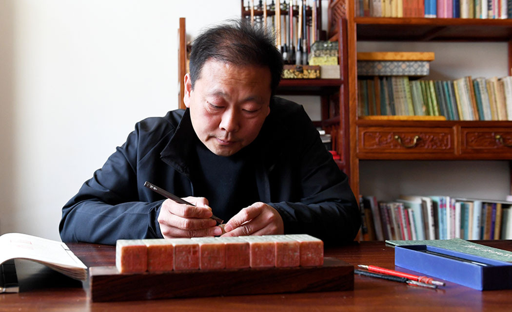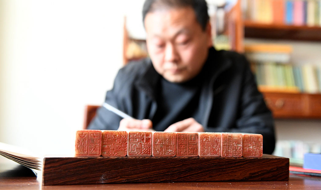 劉琦在研讀篆刻書籍。崔賢飛 攝