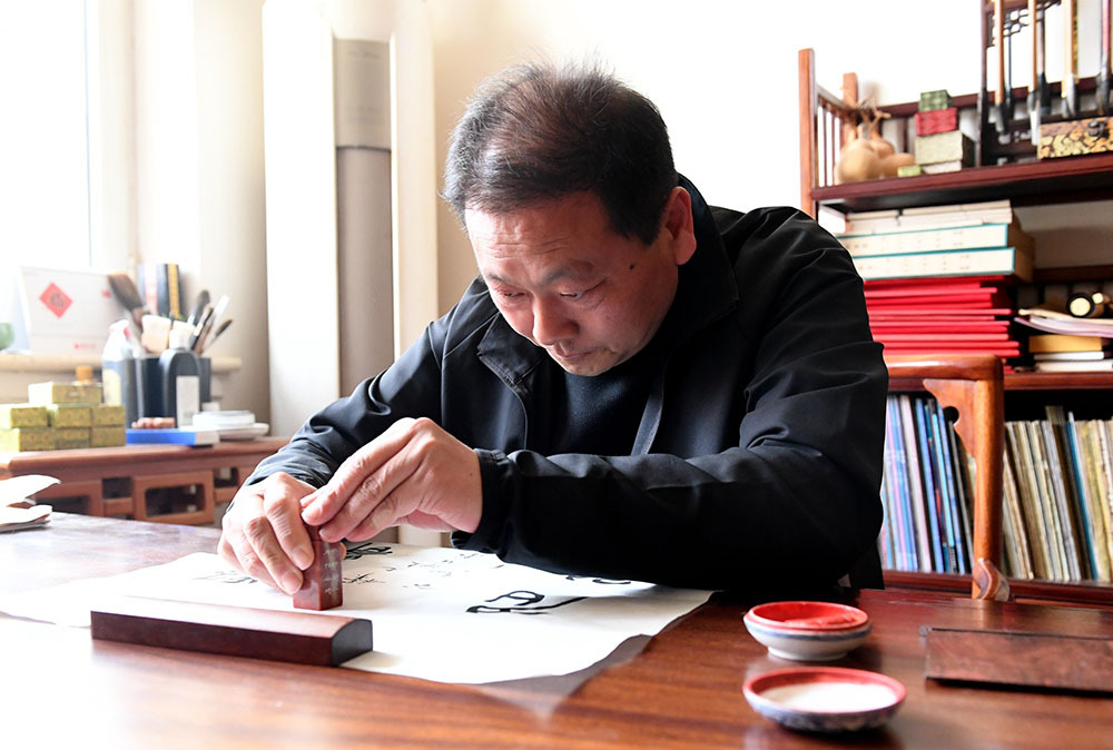 劉琦在書法作品上加蓋印章。崔賢飛 攝