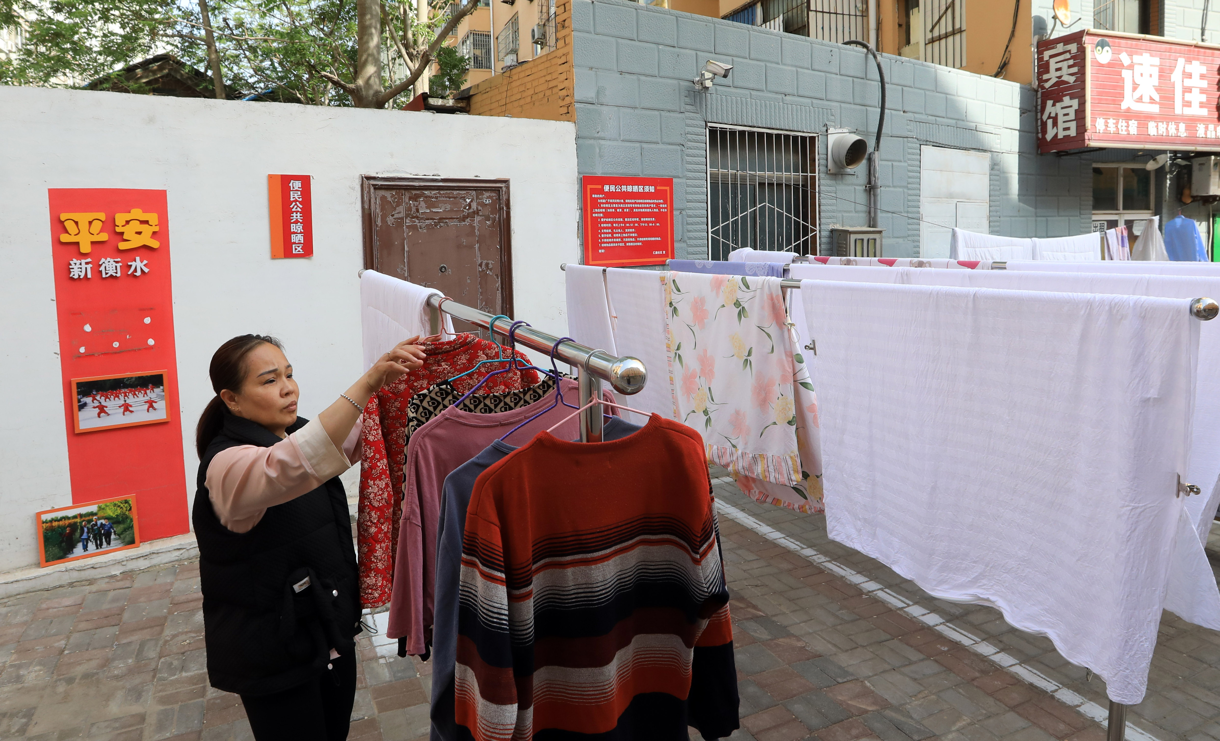 為杜絕隨意拉繩掛曬現象,營造和諧有序的小區環境,匯鑫社區在廣平胡同合理規劃建設“便民公共晾曬區”,安裝“共享晾衣架”,方便市民集中晾曬。圖為附近居民在“便民公共晾曬區”晾曬衣物。