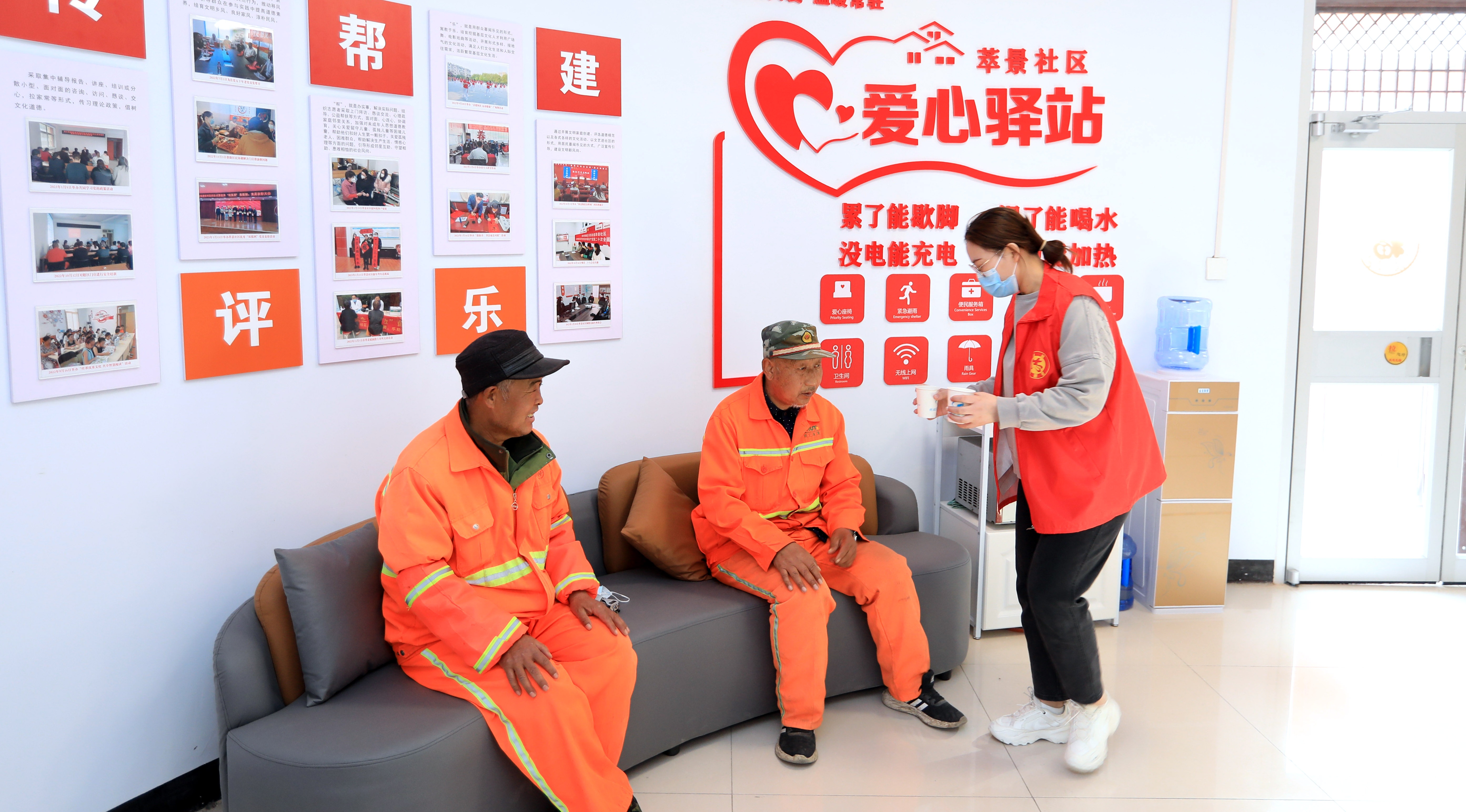 萃景社區愛心驛站內設有飲水機、醫療急救箱、公益書籍等公益物品,同時也裝有手機充電設備、休息椅、微波爐等公益設備,為環衛工、快遞員、出租車司機、交警等戶外工作者和前來辦業務的居民提供休息和其他便利。圖為萃景社區工作人員為休息的環衛工人提供熱水。