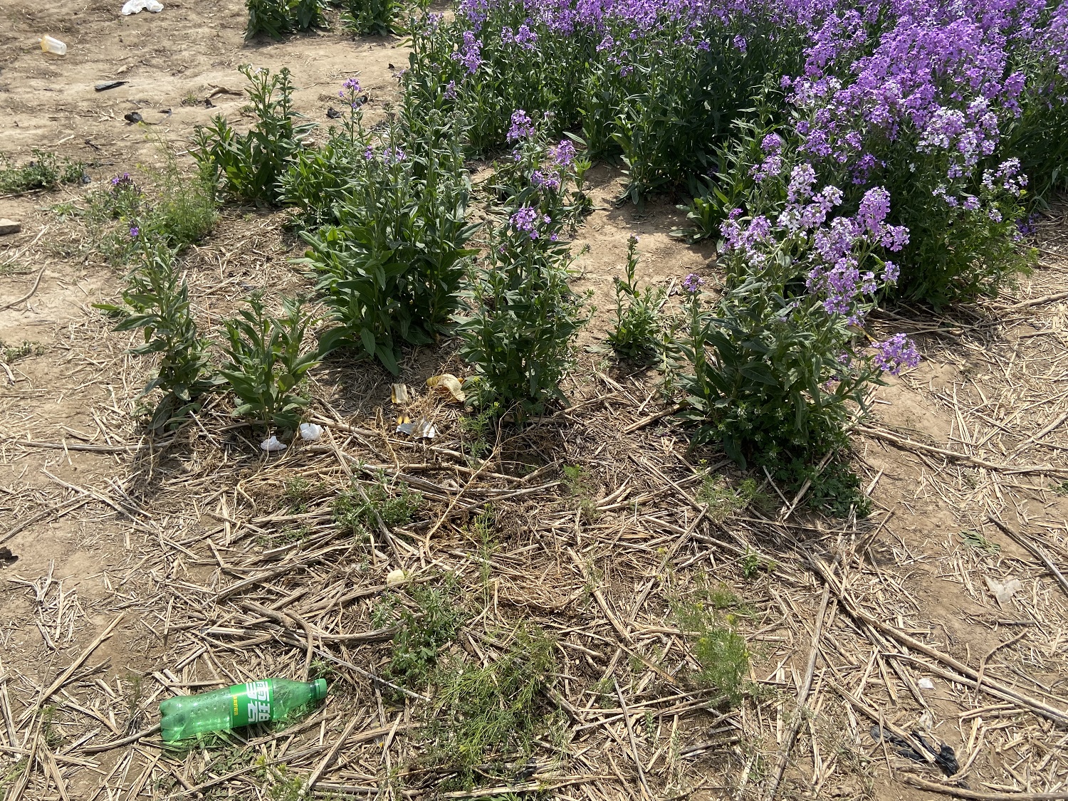 4月27日,記者在大地花海看到,為了獲取更好的拍攝角度,部分游客走進藍香芥花海中,有些人一個不留神,直接踩在花莖上,導致整株折斷倒在地上。還有人看著花開正好,抱著“花開堪折直須折”的想法,滿手都是折斷的花朵。還有人將美食帶到花海中食用,產生垃圾后隨意丟棄。