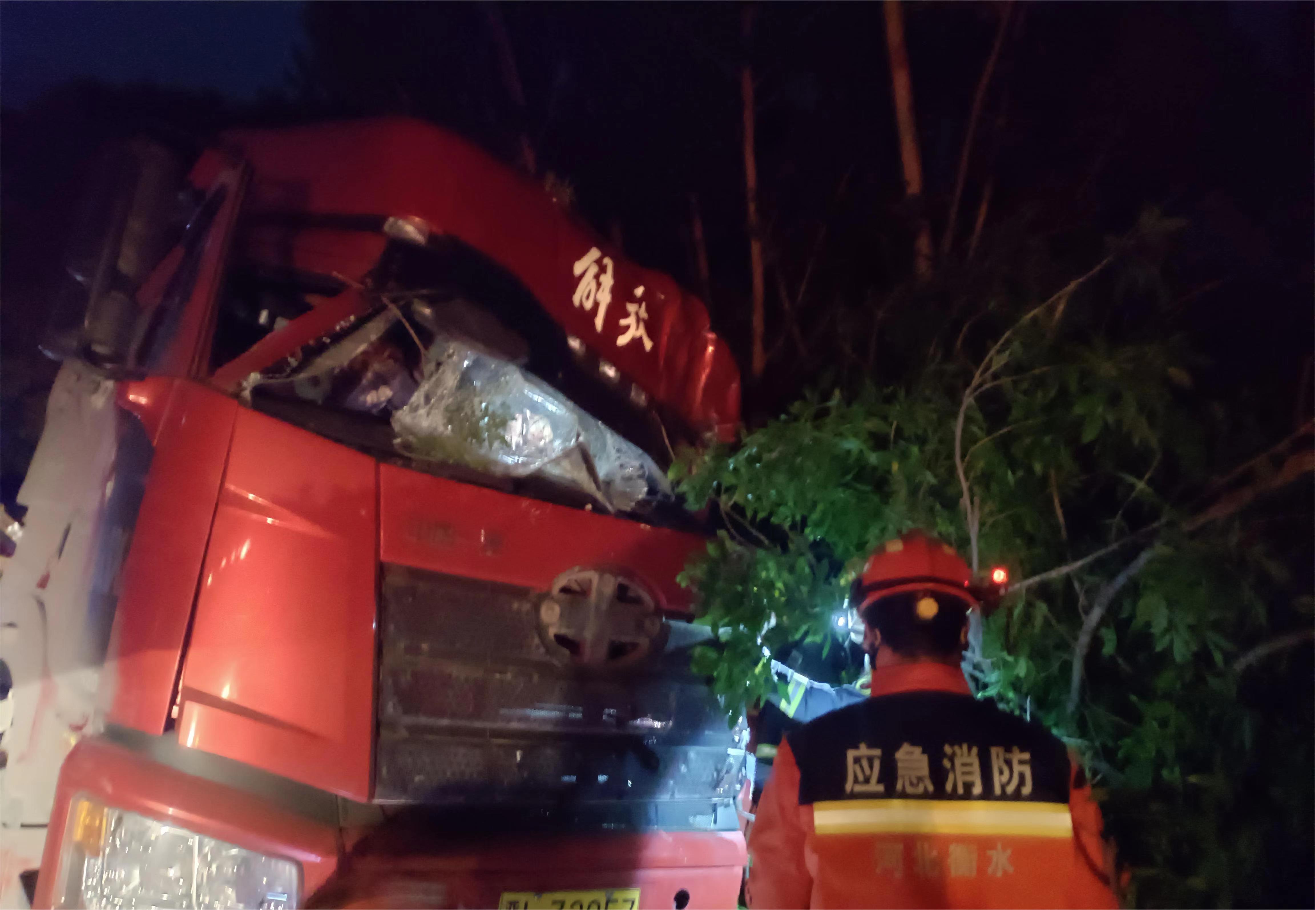 油罐車凌晨撞上路邊綠化樹,司機被困駕駛室,景縣消防緊急救援,僅用20分鐘成功助司機脫險。