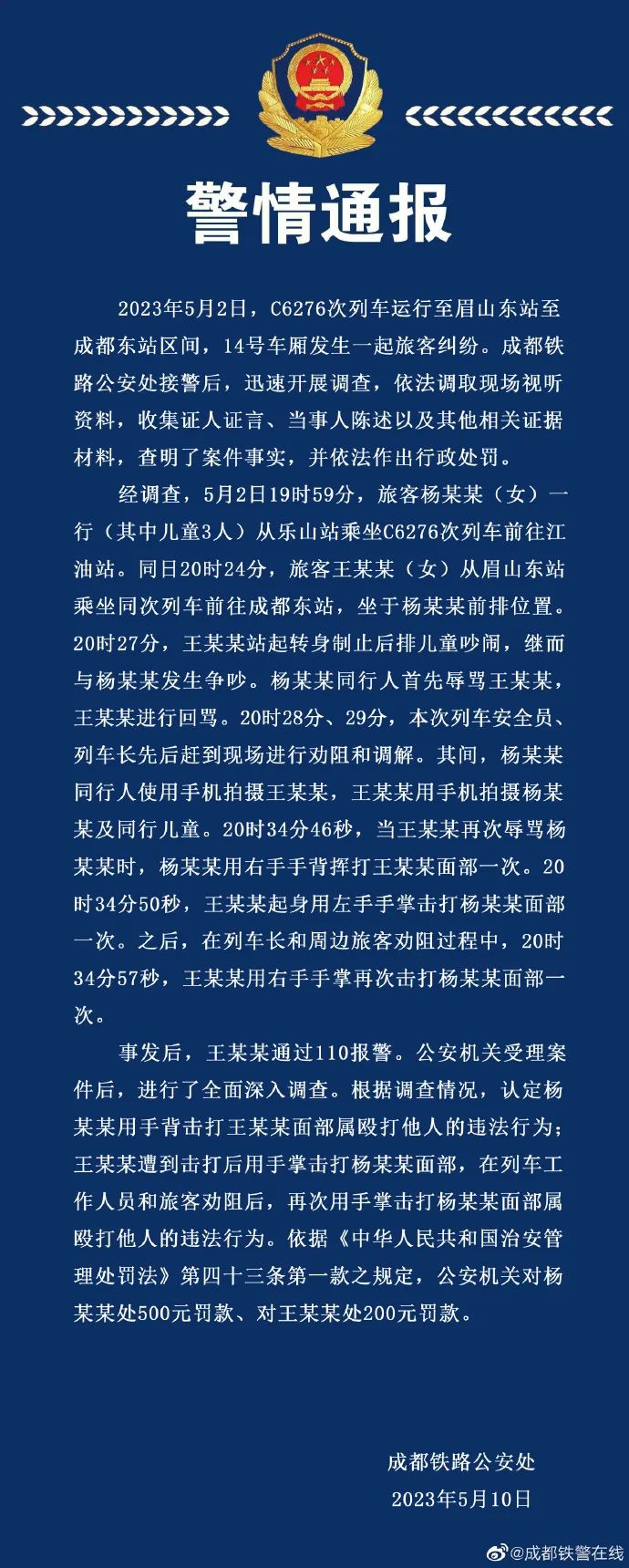 5月10日,成都鐵路公安處通報“高鐵掌摑糾紛事件”。