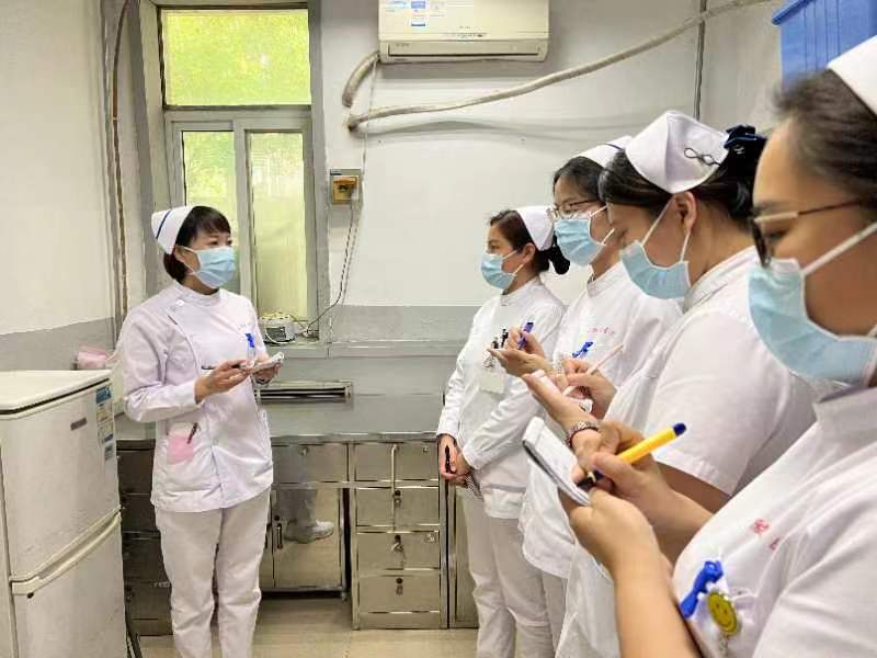 靳鑫(左)帶領科室護理人員利用晨會開展專業學習