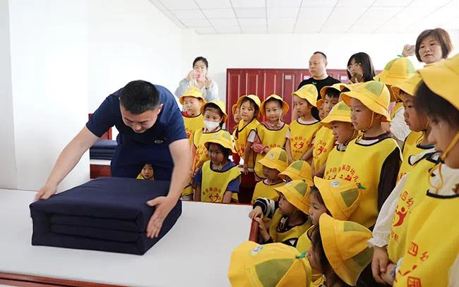 活動中,消防人員帶領師生及家長們參觀了執勤消防車輛、消防器材等,并詳細講解消防車的名稱、功能、操作注意事項及車內各類救援器材在滅火救援任務中的用途。隨后,孩子們乘坐了登高梯,進行了疊被子訓練,孩子們對消防員的工作和生活有了更加直觀的認識與感受。大隊宣講員還通過淺顯易懂的語言為小朋友們講解了火災的危害、緊急情況下的疏散逃生、初起火災撲救方法和災害避險等常識。消防知識宣傳普及加強,幼兒園師生及家長的消防安全和逃生自救意識得到顯著提高。