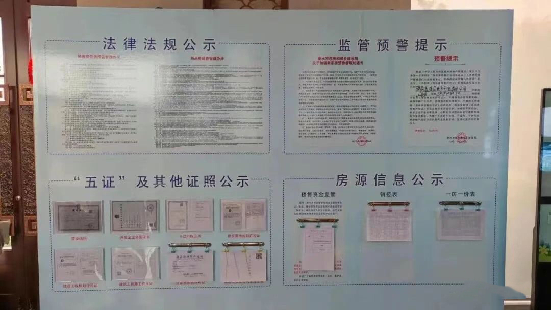 據介紹,《通知》中要求規范標準公示的內容共包括五方面:一是法律法規公示,即商品房銷售管理辦法、城市商品房預售管理辦法;二是監管預警提示,即衡水市住房和城鄉建設局關于加強商品房預售管理的通告、預警提示;三是“五證”及其他證照公示,即房地產開發企業營業執照、房地產開發企業資質證書、不動產權證書(國有土地使用證)、建設用地規劃許可證、建設工程規劃許可證、建筑工程施工許可證、商品房預(銷)售許可證、商品房買賣合同示范文本;四是房源信息公示,即預售資金監管帳號信息、銷控表(采用“已售”、“未售”等銷售狀態信息對全部房源進行標注,并實時更新)、一房一價表(標明每套商品房的建筑面積、銷售單價、總價);五是樓盤銷售狀態公示,即售樓處有沙盤的,要在樓棟模型上張貼銷售狀態公示牌(沒有沙盤的在項目鳥瞰圖上公示),內容包括項目名稱、幾號樓、已取得或未取得商品房預售許可證、在售、售完、禁售,尺寸大小以不小于樓棟模型高度2/3為準。