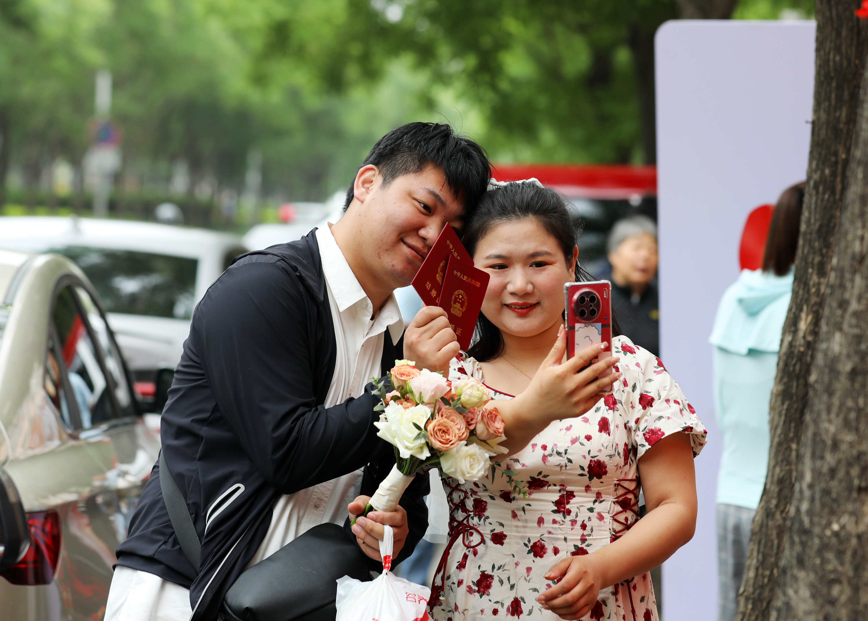 7時許,在登記大廳內,經過檢驗證件、填寫表格等手續后,工作人員蓋上鋼印,將紅色的結婚證交到新人手中,同時為新人們送去真摯的祝福。一對對新人小心翼翼地接過愛情的“證書”,并拍照記錄下這難忘而甜蜜的時刻。
