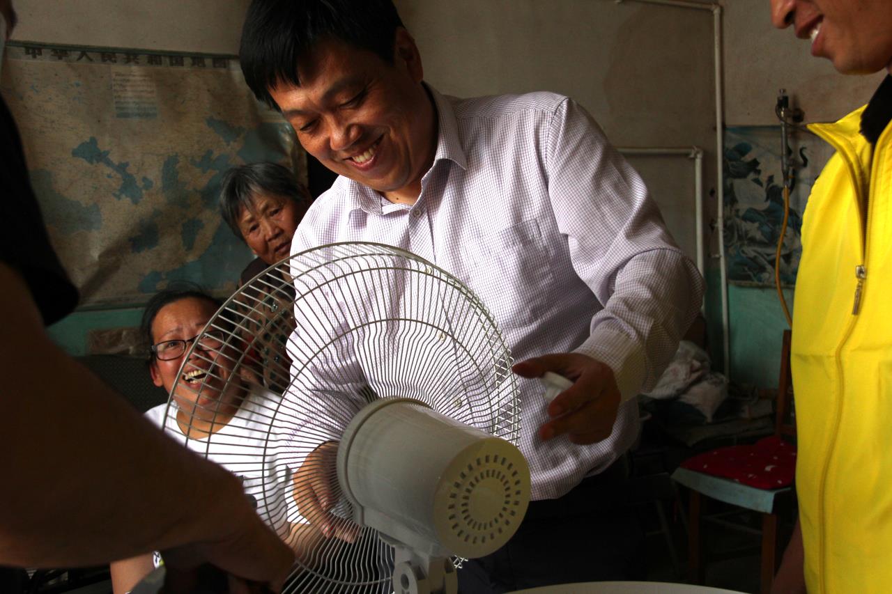 當天下午,衡水市春暉義工協會會長陳奇峰帶領志愿者來到趙麗芳家,他們與趙麗芳聊家常,深入了解她的生活需求及遇到的困難,囑咐她要照顧好自己的身體。現場,志愿者送上米、面、油,并現場安裝好送去的落地扇。看到電風扇轉動起來,趙麗芳連聲道謝。