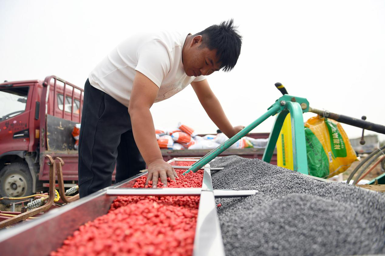 北魏鎮牛莊村花生種植基地,村民碼放花生種子和化肥。