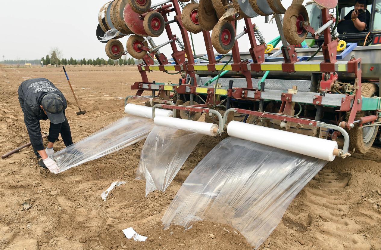北魏鎮牛莊村花生種植基地,村民為花生覆膜壓土。