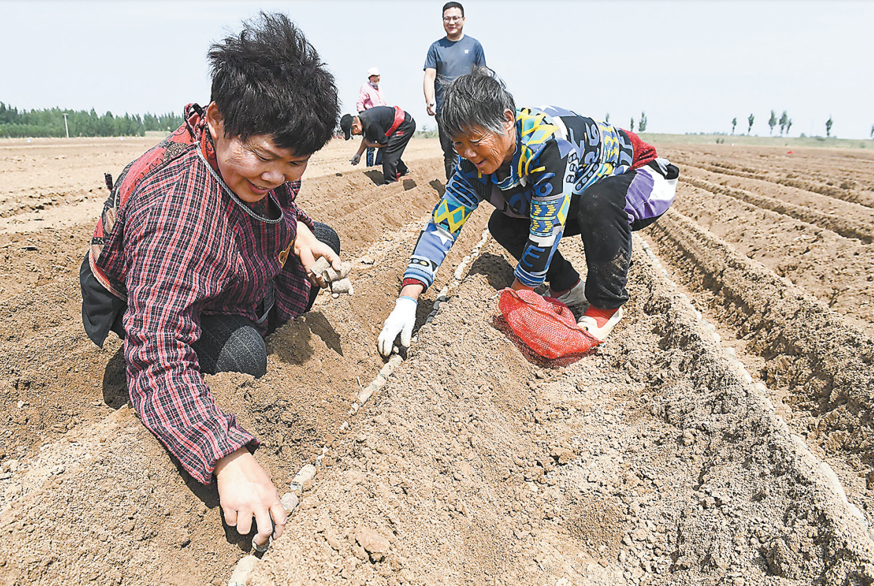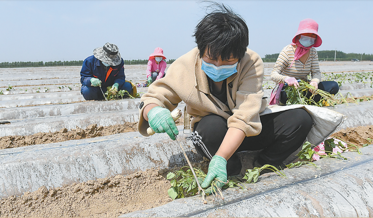 平舒鎮鄭裴莊村村民栽種紅薯秧。