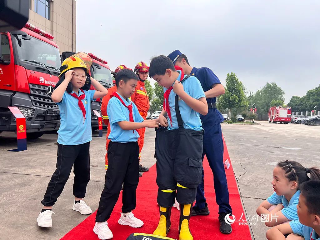 5月30日,河北石家莊市消防救援支隊藁城大隊通過消防站開放的形式,開展“安全童行薪火相傳”為主題的消防宣傳活動,迎接海英小學(xué)的師生參觀學(xué)習(xí)。人民網(wǎng)記者 周博攝