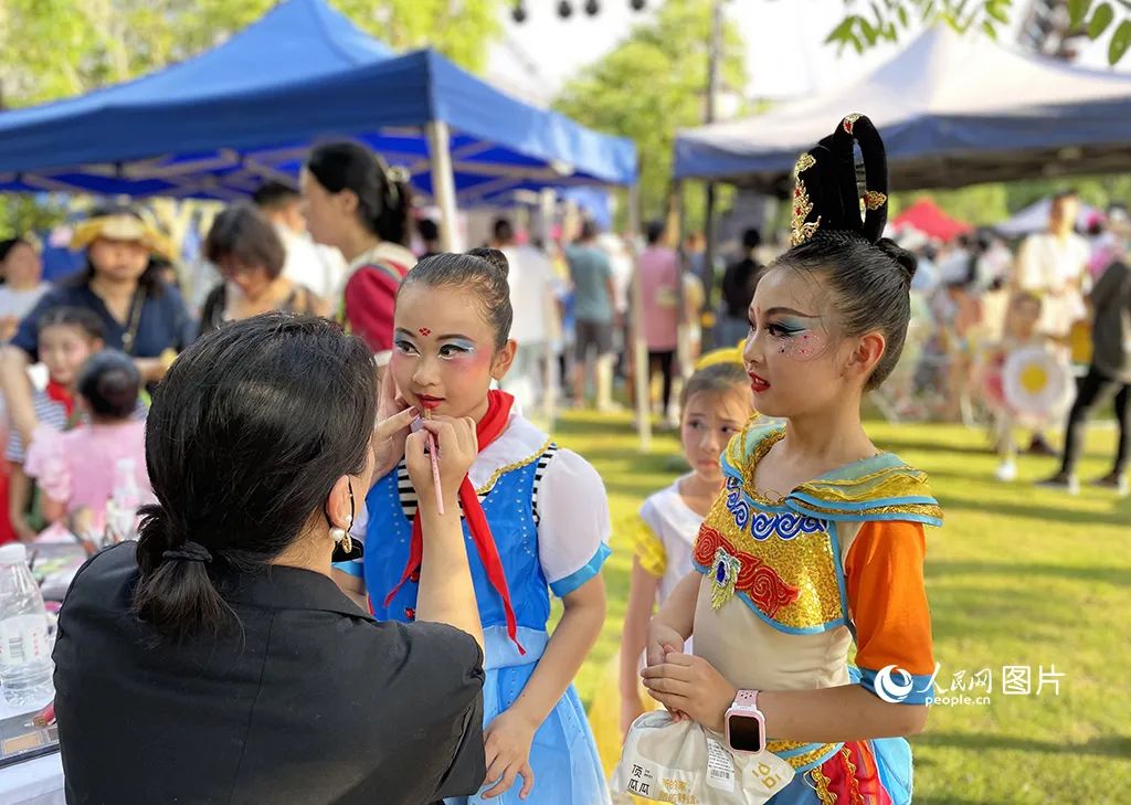 5月26日,湖北武漢東湖高新區(qū)花山街道白羊山社區(qū)聯(lián)合舉辦以“‘童’心協(xié)力 共創(chuàng)未來”為主題的“六一”兒童節(jié)文藝匯演。老師在演出現(xiàn)場,為小朋友們補(bǔ)妝。人民網(wǎng)記者 關(guān)喜艷攝