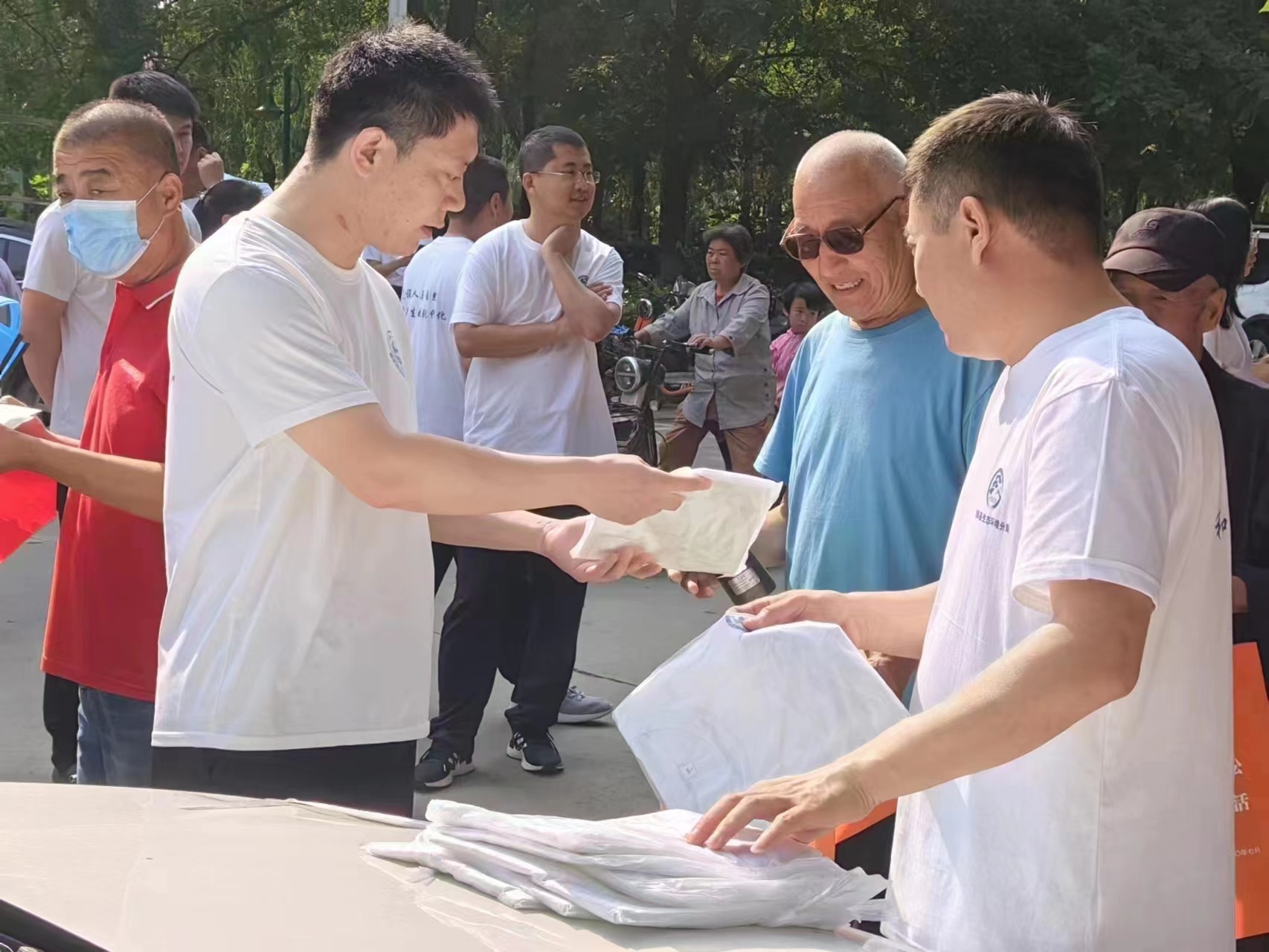 工作人員為群眾發(fā)放宣傳文化衫。饒陽縣融媒體中心供圖