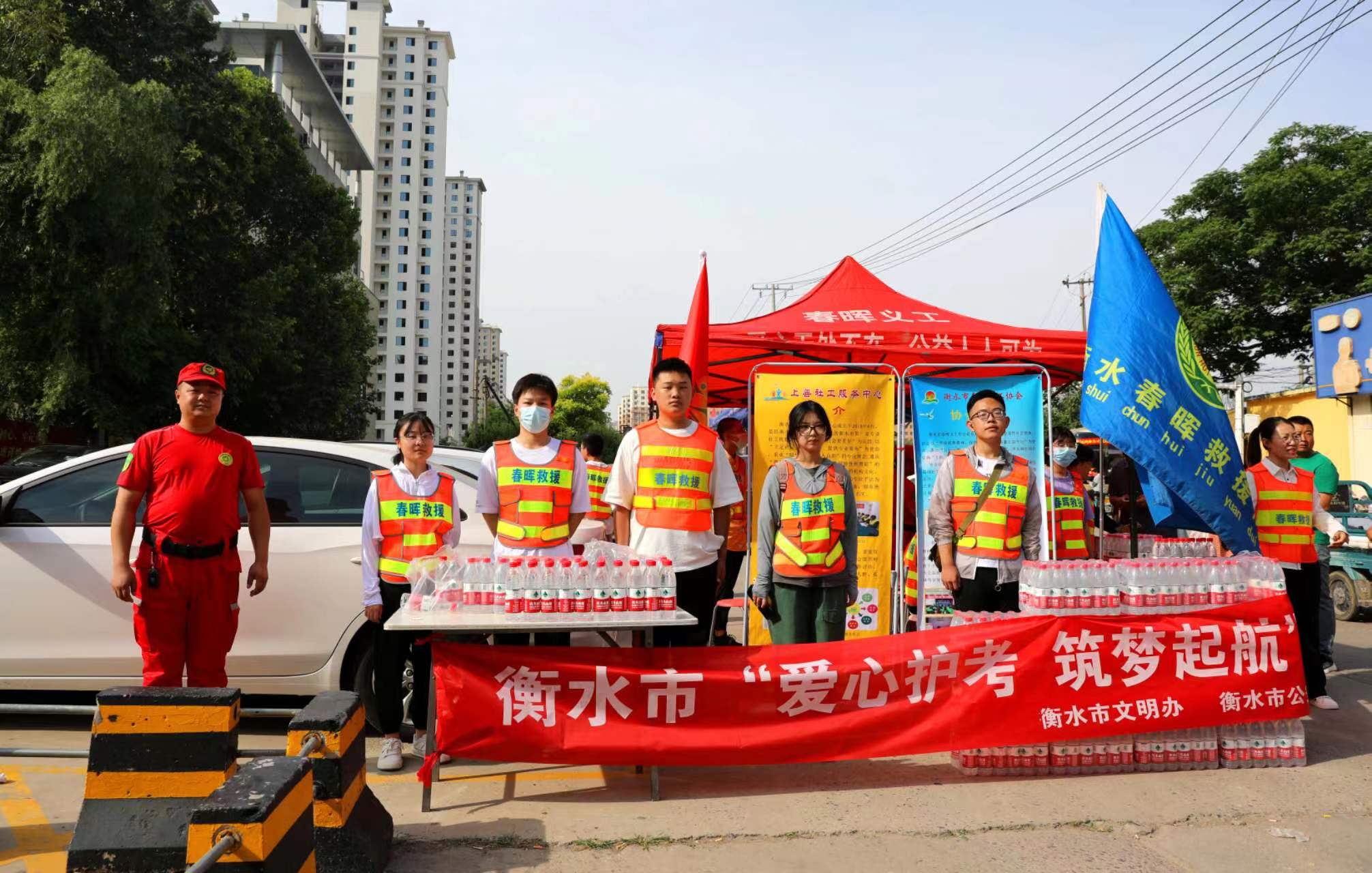 在衡水中學考點外,衡水遠航公益老孟愛心團的志愿者們身穿紅馬甲,正在開展志愿服務,他們準備了免費的礦泉水、應急藥品等,給所有為高考默默付出的人們送上一份愛心。“能為家長們和保障高考的工作人員提供一點幫助,我心里非常高興,也算是在高考期間為公益事業做點貢獻吧!”負責人孟凡領說。