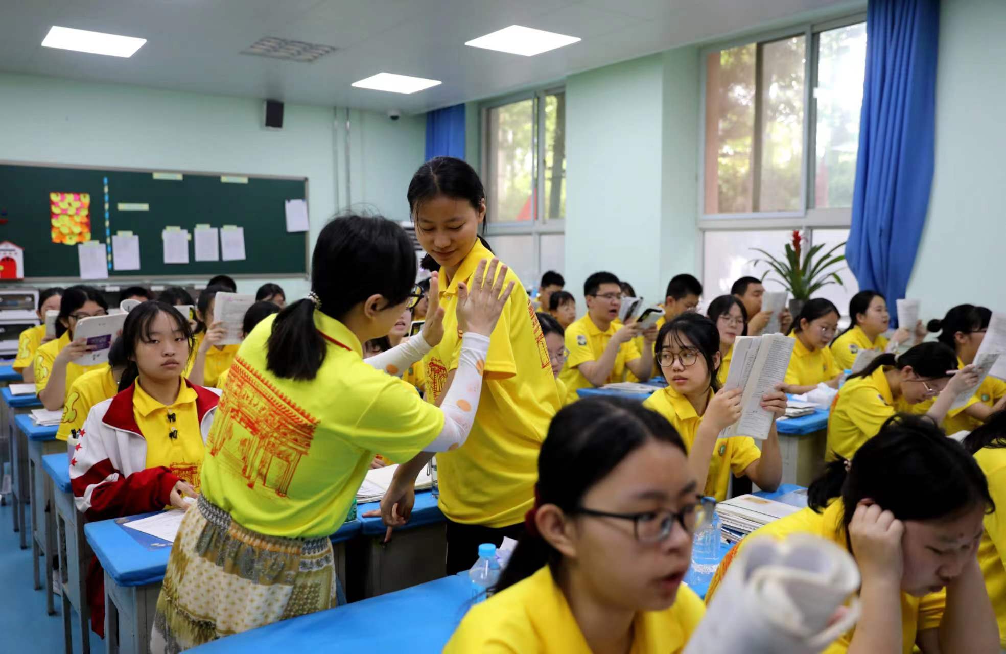 上午7時許,衡水十三中高三教室內,馬上就要赴考的高三學生還在大聲地背誦、朗讀,希望利用考前最后一點時間再為自己“加把勁”。馬上就要去考場了,同學們躊躇滿志、自信昂揚,他們早已蓄勢待發,準備接受高考的考驗。赴考前,老師將提前準備好的貼紙拿了出來,這上面有每個班的小心思,有的是為大家加油打氣的“大拇指”,有的是班級的合影,有的是一句鼓勵的話語。同學們互相將貼紙貼到衣袖上,“全力以赴,不負少年”“超越自我,高考必勝”“加油!一起金榜題名”……教室內、校園中,高三學子們一聲聲鏗鏘有力的吶喊,充滿了自信與力量。