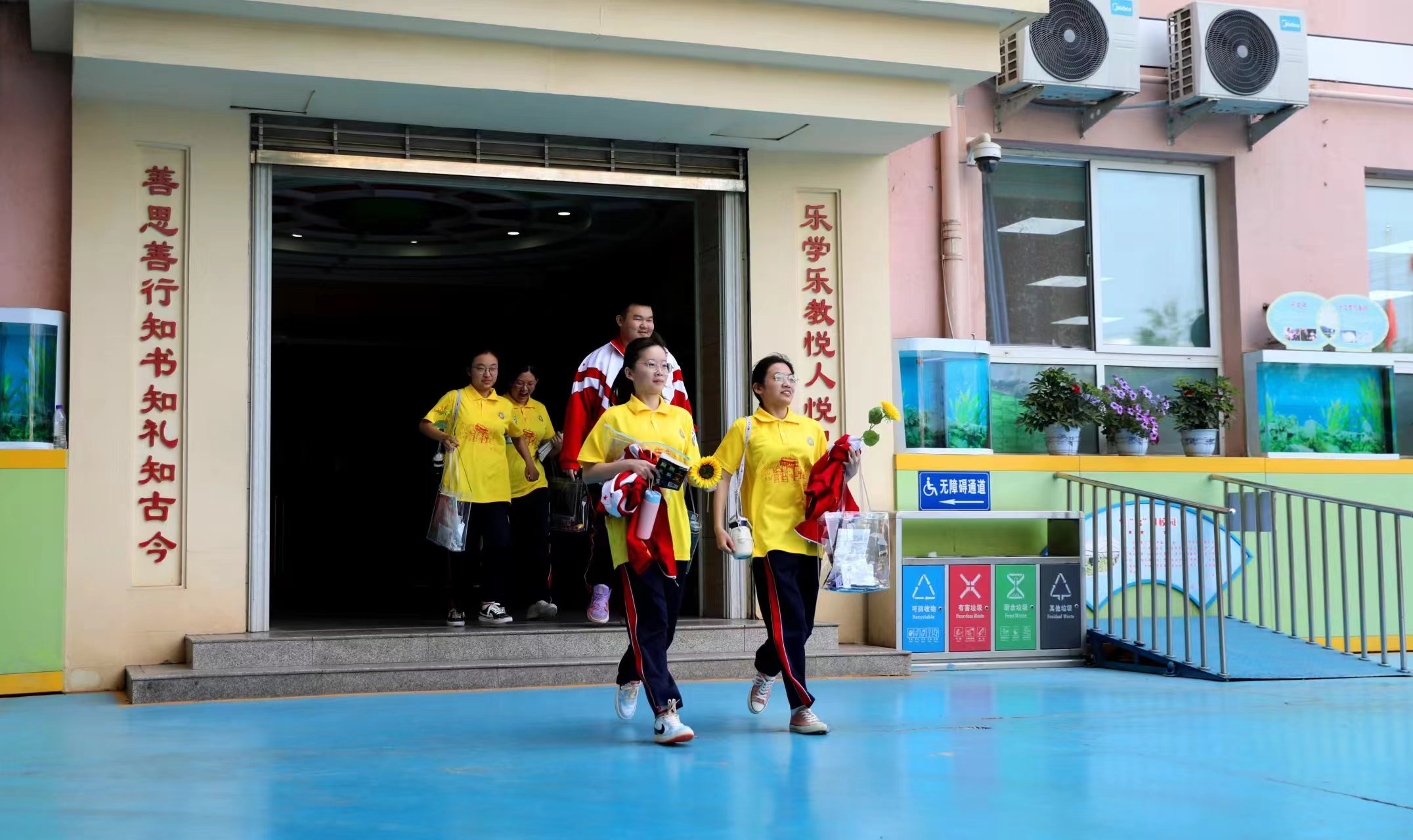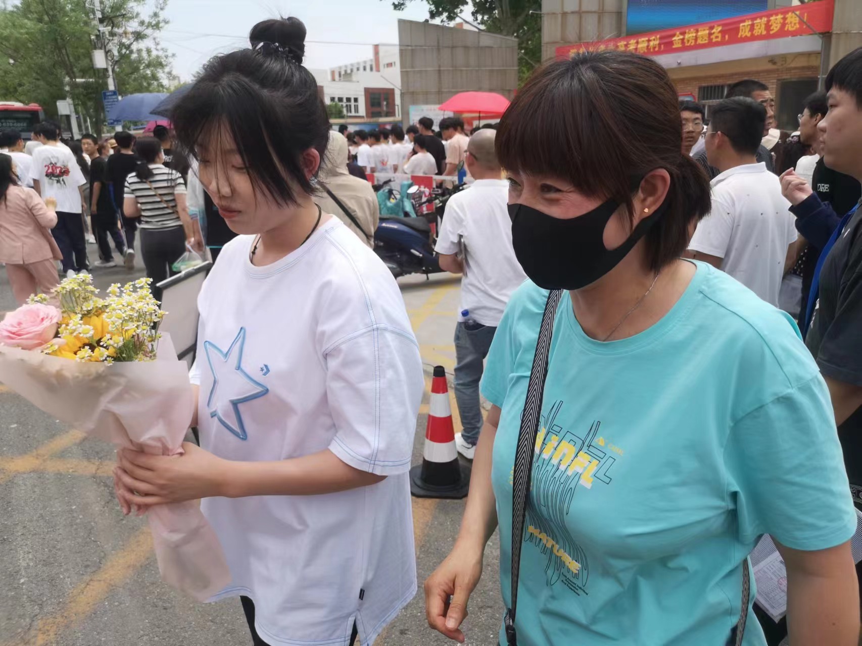 考試結束的鈴聲響起,考生們紛紛按指令走出考場。等待已久的家長、老師迎上前來,為他們送上鮮花和祝福。有的家長緊緊擁抱著孩子,有的老師點頭贊許地拍拍肩膀。他們用各種方式表達著對學子們的關心和支持。凌晨三時,從外地坐火車趕回來的任女士說,她于六時許到達考場門口后,一直守到了現在。看到女兒出來以后,任女士趕忙遞上菊花茶,雖然女兒只能匆匆喝了幾口就上了校車,但任女士心里依然很高興。