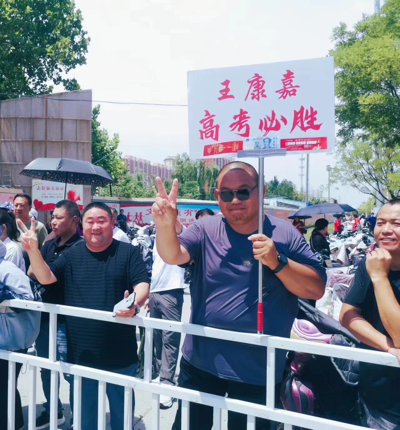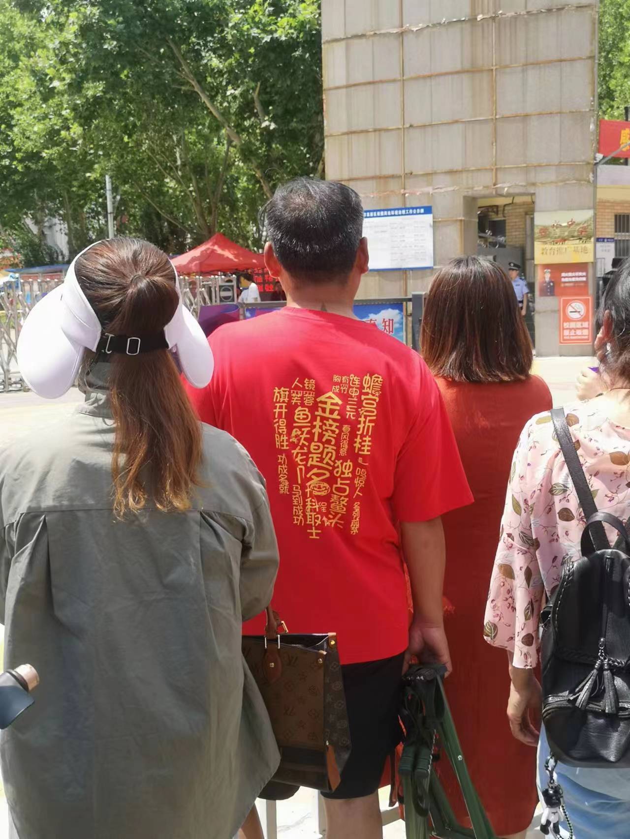 說起孩子,每個家長都掩飾不住對孩子的疼愛之情。保持一顆平常心,哪怕是見不到也默默守候在考場外,用這樣的方式陪伴孩子,以得到心里的‘踏實’,這是劉先生和妻子表達對自己重視孩子的方式,估計也是大多數家長的表達方式。火紅的T恤,前書“金榜題名”,后書“蟾宮折桂、旗開得勝”等字樣,手捧一束向陽花,這是王先生為給女兒加油助威而定制的服裝,他的愛人也身著旗袍,夫妻二人對女兒的用心程度可見一斑。