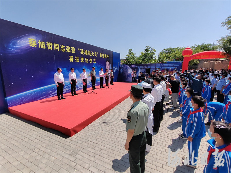 當天上午10時許,在蔡旭哲的家鄉,送喜報隊伍宣讀了中共中央、國務院、中央軍委關于授予蔡旭哲同志“英雄航天員”榮譽稱號并頒發“三級航天功勛獎章”的表彰決定。隨后,省市軍地領導與蔡旭哲進行了視頻連線,蔡旭哲表示,“能夠代表祖國出征太空,是我的職責和使命。任務的成功離不開國家的培養,更離不開家鄉人民的關心和支持,榮譽的所得,應該屬于國家,也屬于家鄉人民。我將不忘初心、牢記使命,繼續前行,時刻準備著再次出征太空,為國家爭光,為咱們家鄉添彩。”
