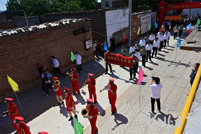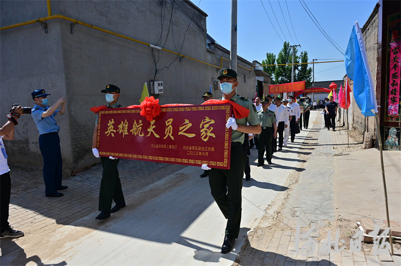 6月6日,在“英雄航天員”蔡旭哲的家鄉深州市,省軍地等有關單位和部門組成立功受獎報喜團,為蔡旭哲家庭敬送喜報,并為蔡旭哲家庭贈送了“英雄航天員之家”牌匾和慰問金。河北日報記者焦磊攝