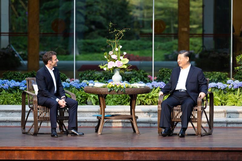 △2023年4月7日,習近平主席同法國總統馬克龍在廣東省廣州市松園臨水而坐,觀景品茗,縱論古今。