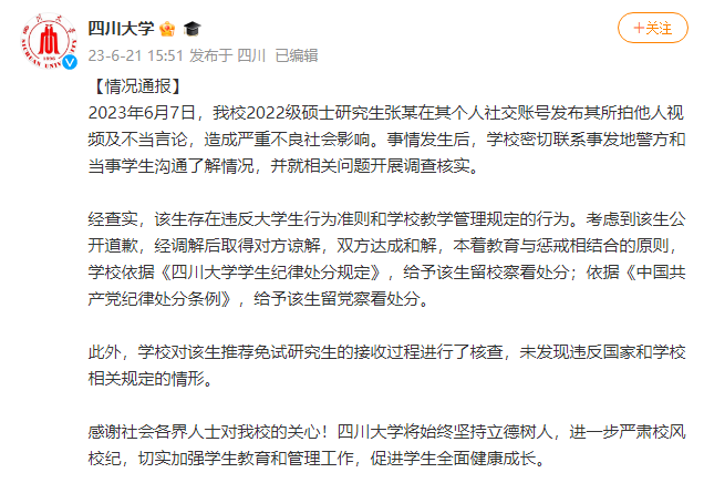 經(jīng)查實(shí),該生存在違反大學(xué)生行為準(zhǔn)則和學(xué)校教學(xué)管理規(guī)定的行為。考慮到該生公開道歉,經(jīng)調(diào)解后取得對(duì)方諒解,雙方達(dá)成和解,本著教育與懲戒相結(jié)合的原則,學(xué)校依據(jù)《四川大學(xué)學(xué)生紀(jì)律處分規(guī)定》,給予該生留校察看處分;依據(jù)《中國共產(chǎn)黨紀(jì)律處分條例》,給予該生留黨察看處分。