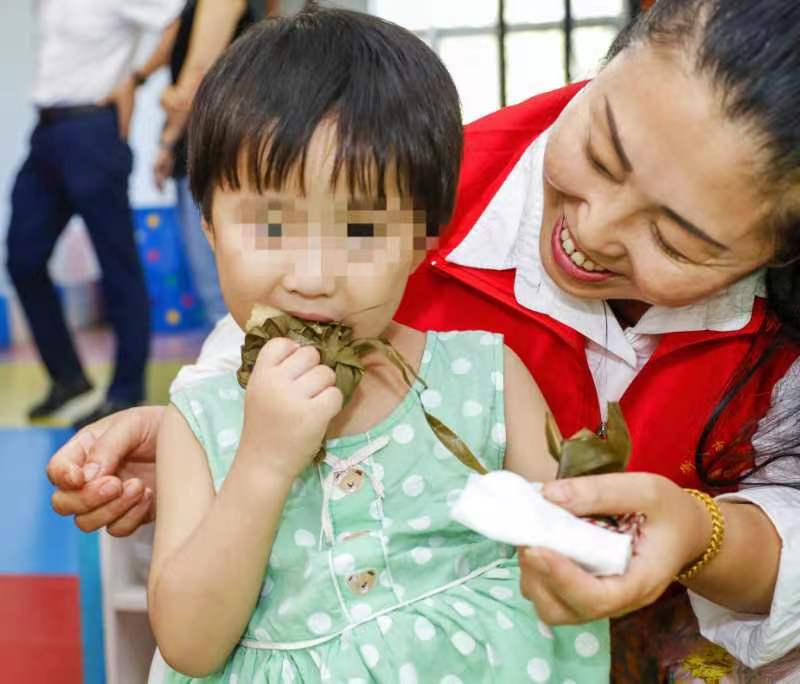 “阿姨真好吃。”“那就多吃點,好孩子。”“嘻嘻,謝謝阿姨。”隨后,志愿者還與孩子們親切互動,并為他們送上愛心粽子,祝愿他們端午安康。