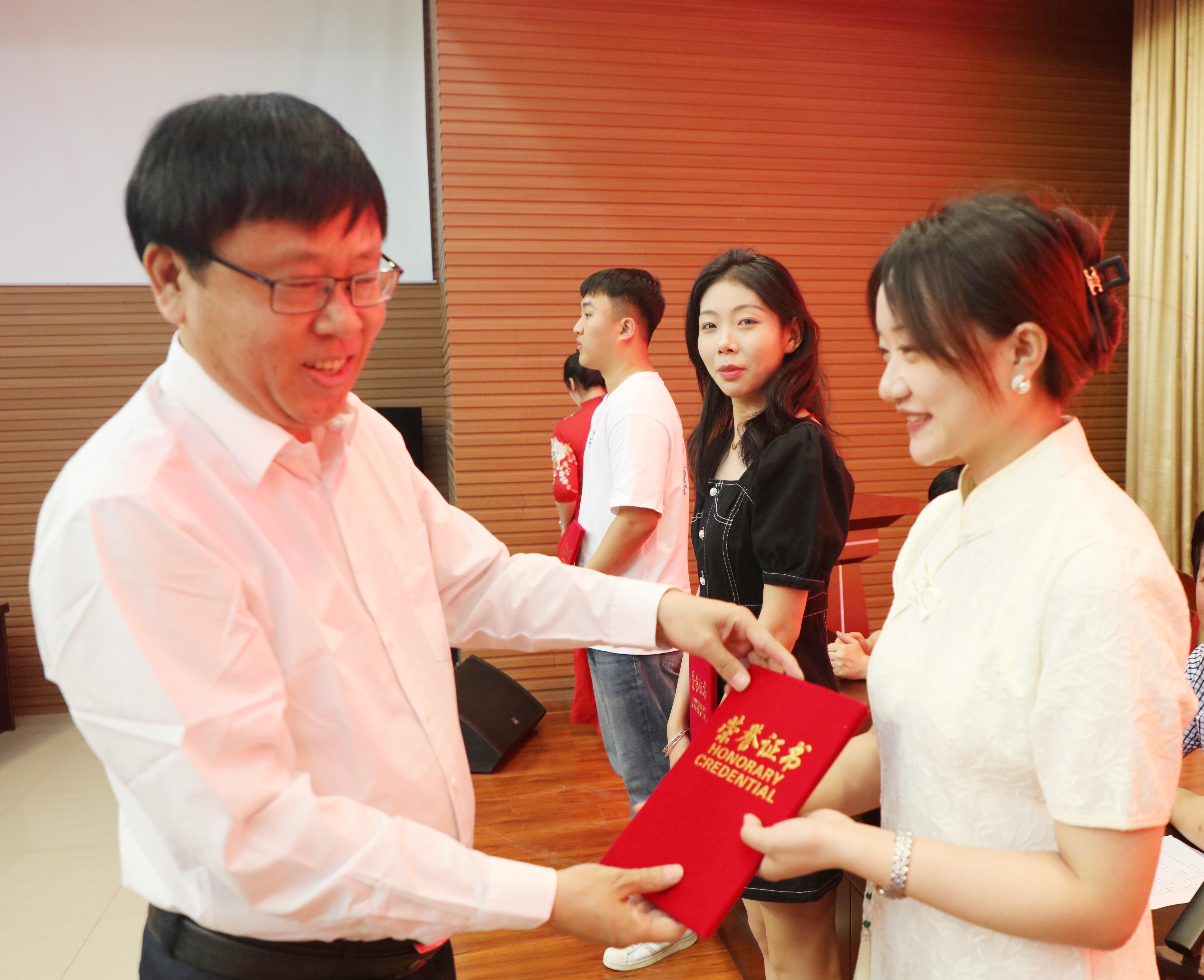 在畢業證書和省級優秀畢業生證書授予儀式上,黨委書記李增軍、校長李建廣等校領導為學生代表一一頒發證書并握手、合影留念,共同見證他們人生中這個莊嚴又歡樂的時刻。
