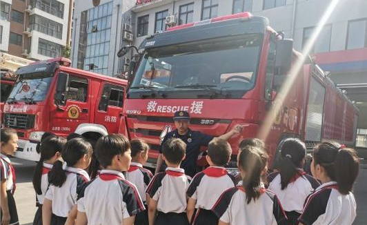 消防員為學(xué)生們介紹消防車(chē)。饒陽(yáng)縣融媒體中心供圖