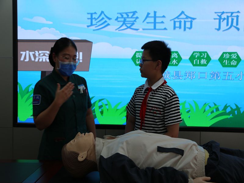 故城縣醫院醫護人員向大家講解和演練了人工呼吸及心肺復蘇等岸上救生技能,讓觀摩的中小學生切實領會自救、互救、施救的原理和方法。
