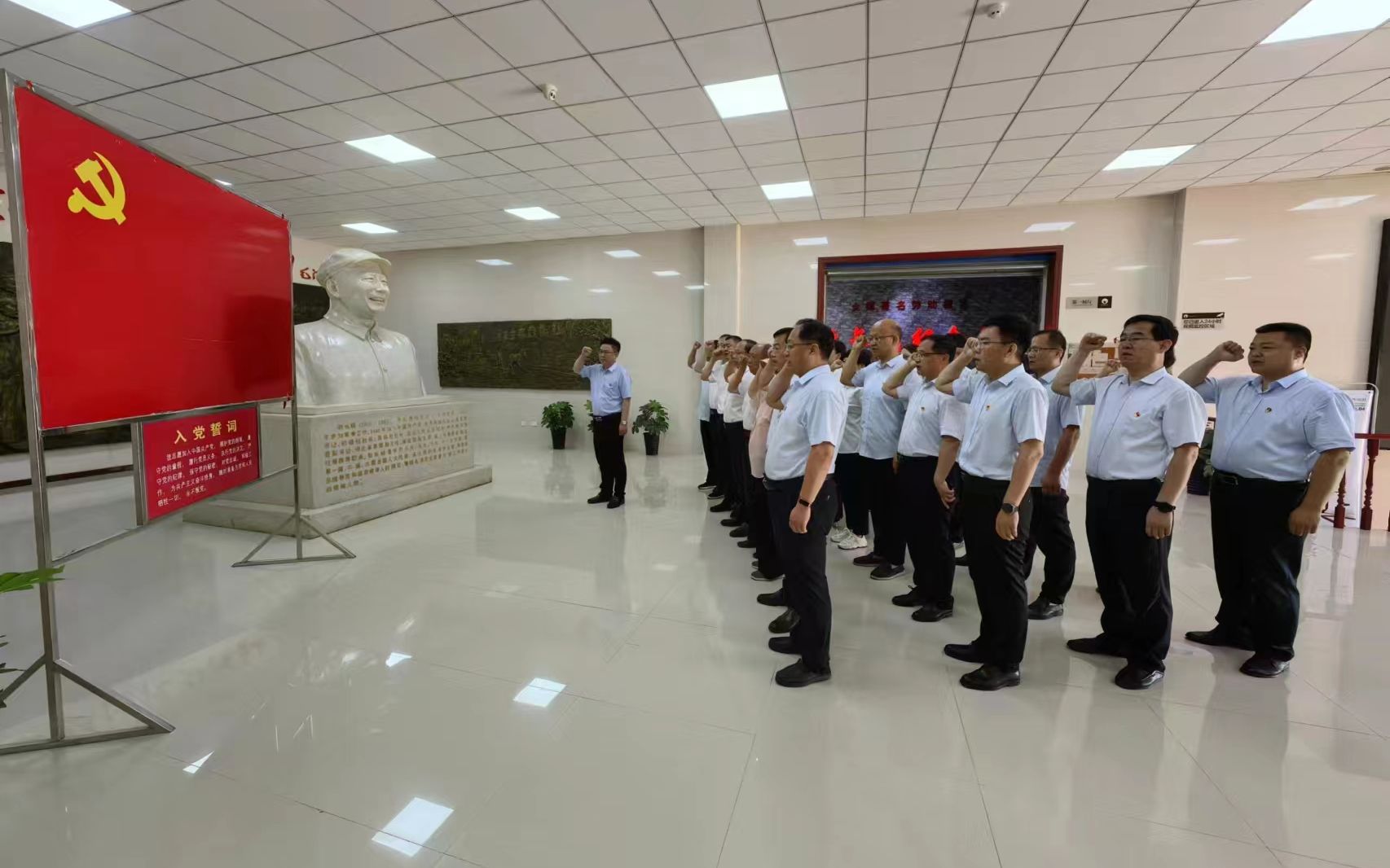 在紀念館,全體黨員面對鮮紅黨旗,莊重宣誓,重溫對黨的承諾。