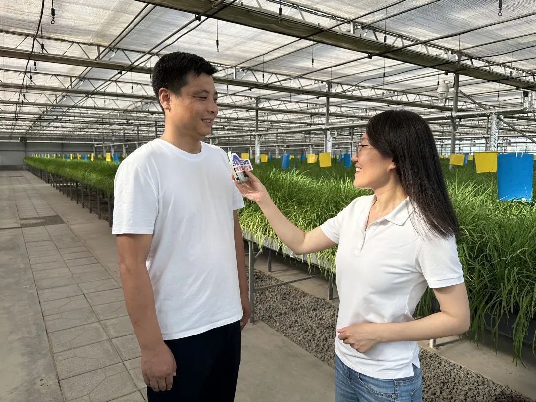 周彥偉向記者屈冠華介紹潮汐式營(yíng)養(yǎng)液育苗技術(shù)