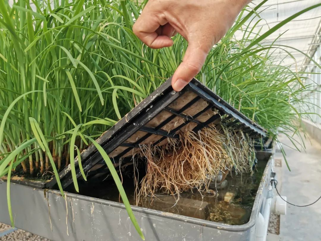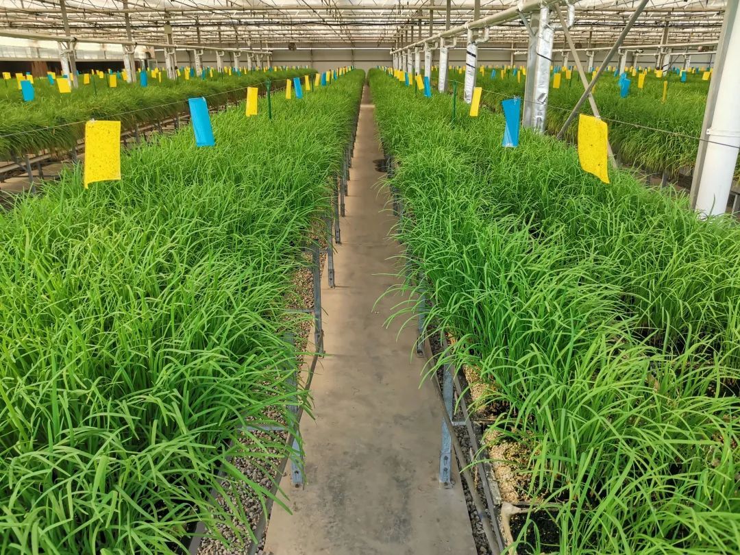陽(yáng)光房的另一側(cè),是京石兩地農(nóng)科院早前成功合作的水培韭菜項(xiàng)目。與傳統(tǒng)韭菜栽培相比,這里的韭菜種在播種紙上,根系生長(zhǎng)在營(yíng)養(yǎng)液中,實(shí)現(xiàn)了韭菜不用農(nóng)藥灌根安全生產(chǎn)的技術(shù)突破。該項(xiàng)目還創(chuàng)新開發(fā)一次播種、無(wú)需移栽的營(yíng)養(yǎng)液栽培技術(shù),韭菜可連續(xù)生產(chǎn)4-5年。周彥偉介紹,這片水培韭菜生長(zhǎng)迅速,每年可收獲8-10茬,產(chǎn)量非常高。目前,已有多家基地采用該技術(shù)種植水培韭菜。